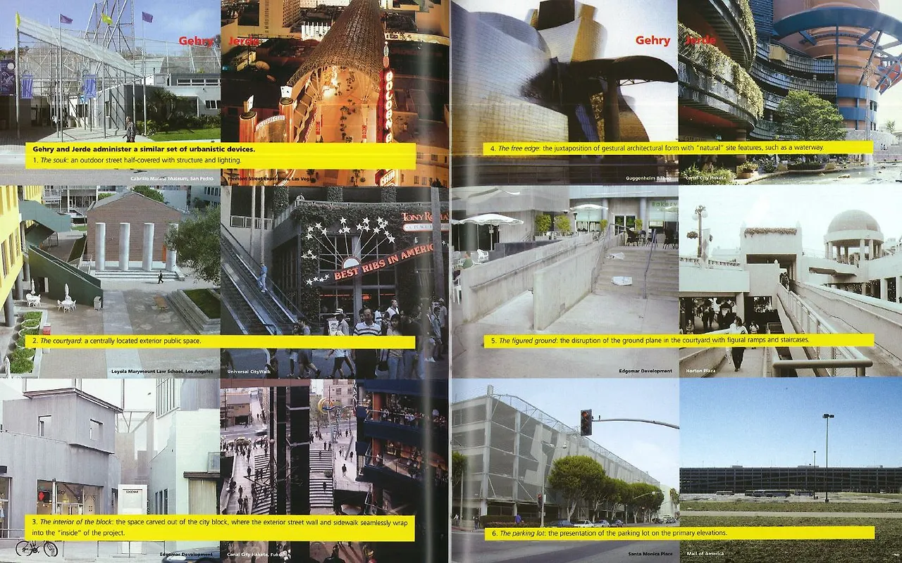 게리는 오랫동안 스타 건축가였으며 세계 각지에서 강의를 하고 수상을 했습니다. 저드는 상대적으로 스타 건축가의 아웃사이더였으며 LA를 벗어나 강의를 한 적이 거의 없다고 합니다. 1977년 이전의 게리와 저드는 많은 쇼핑몰을 만들었습니다. 하지만 1977년 이후 게리는 뮤지엄, 저드는 엔터테인먼트로 각기 다른 방향으로 발전했습니다. 게리는 스스로를 유명 건축가로 만들어 갔습니다. 수많은 뮤지엄을 만들어 왔고 그것은 도시재생의 중심 역할을 했습니다. 반면 1977년 이후 저드의 주요한 고객은 엔터테인먼트 회사였습니다. 그들은 자신들이 생각하는 콘텐츠를 저드에게 주었고 저드는 그것을 건축적으로 만들었습니다. 매년 10억 명이 저드가 설계한 프로젝트를 밟는 다고 할 수 있을 정도로 지구 상에 영향을 받지 않은 도시가 거의 없습니다. 이렇게 그는 엔터테인먼트화 된 도시의 프로토타입을 만들어 갔습니다.