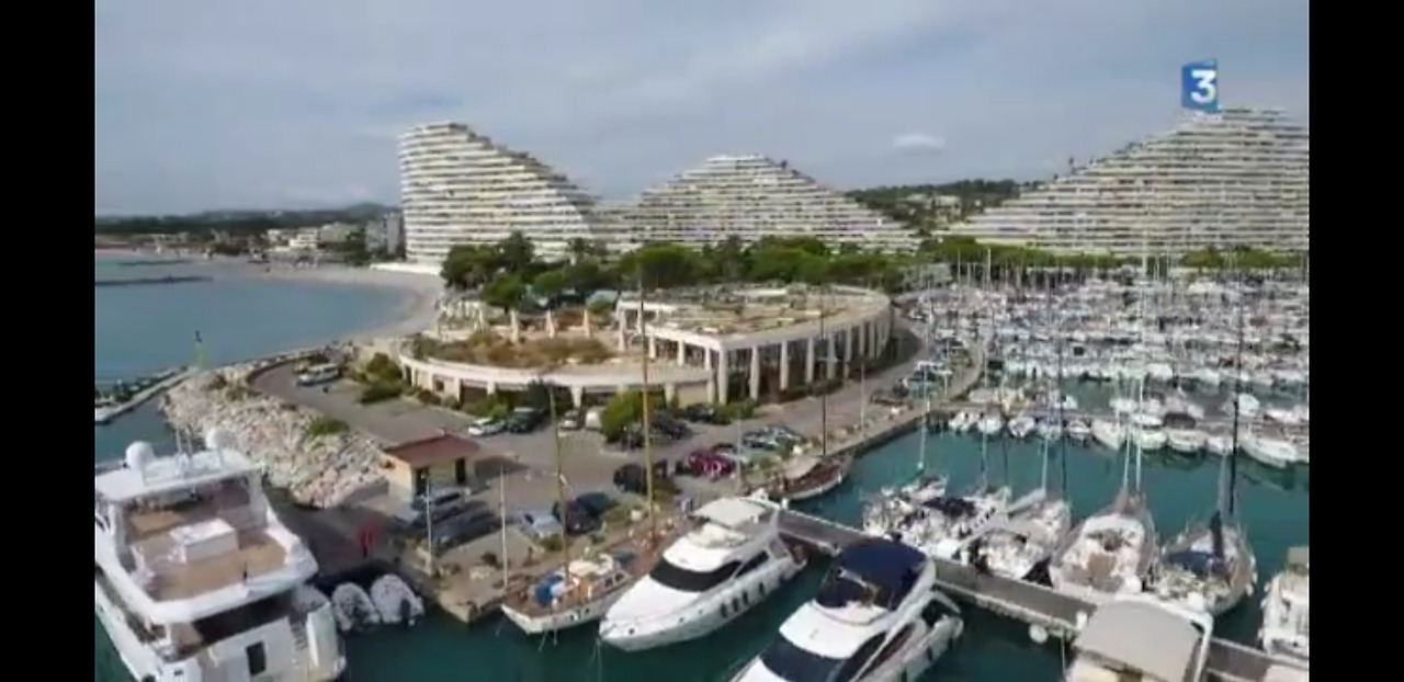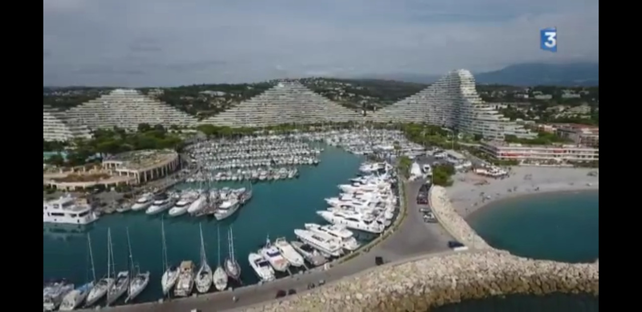 우선 이 곳은 Marina baie des anges라고 불리우며 남프랑스 깐느와 니스 사이에 있는 해안 도시 빌 누베르 루베 (Villeneuve-Loubet) 마리나 단지예요. 거대한 산이나 피라미드, 어떻게 보면 파도 같은 모양을 하고 있는 느낌이 들죠. 지금도 매매 사이트에 매물이 올라오고 있고 초기부터 분양형 콘도나 여행자 아파트로 단지로 개발된 것으로 같아요. (개인적으로 요즘 한국에서 핫한 생활형 숙박시설에 가까운 시설 같기도 해요.) 1968년에 개발자 Jean Marchand과 건축가 André Minangoy에 의해 개발되었으며, 당시에는 바다의 풍경을 독차지하는 거대한 콘크리트 산이라며 세간의 비평을 받았지만 오히려 지금은 시대를 앞서가는 디자인으로 문화부의 건축유산이 되었다고 하네요.