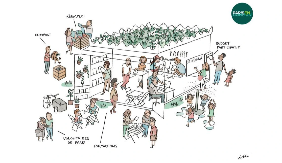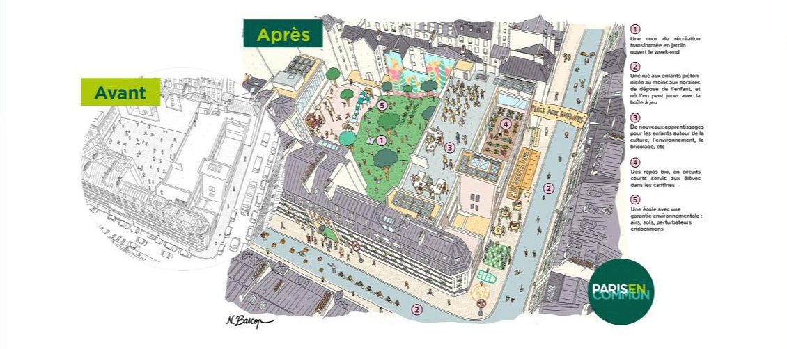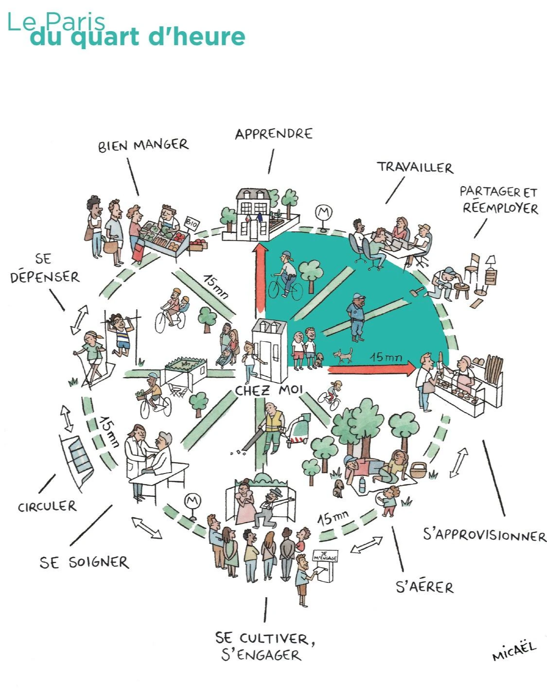 위에 그림은 내 집을 나서면 배우고, 일하고, 나누고, 재활용하고, 식료품을 구입하고, 바람을 쐬고, 문화생활을 하고, 치료를 받고, 대중교통 이용하고, 칼로리를 소비하고, 먹고사는 모든 생활은 걸어서 15분 안에서 가능하다는 것을 보여주고 있어요. 저렇게 살려면 집 근처에 다양한 도시의 인프라가 필요하겠죠. 성인 기준으로 15분이면 걸어서 1km를, 자전거로는 2.5km를 갈 수 있다고 하니 넉넉 잡아 반경 3km 안에 모든 생활 인프라가 구비되어야 한다는 결론을 내릴 수 있겠네요. 우리의 '10분 동네'는 생활 인프라인 공공건축을 확충하는 슬로건의 느낌을 주지만, 파리의 '15분 도시'에서는 우선 기존에 있는 인프라를 입체적으로 다각적으로 활용하는 방법으로 해결책을 찾고 있다는 차이점을 볼 수 있어요. 파리시는 거리, 광장, 공원 같은 도시의 공공재를 유지, 보수하고 미화하는데 방점을 두고 시민들의 삶의 질을 올리는 데 연간 10억 유로를 들이고 5,000명의 고용을 창출할 예정이라고 해요.