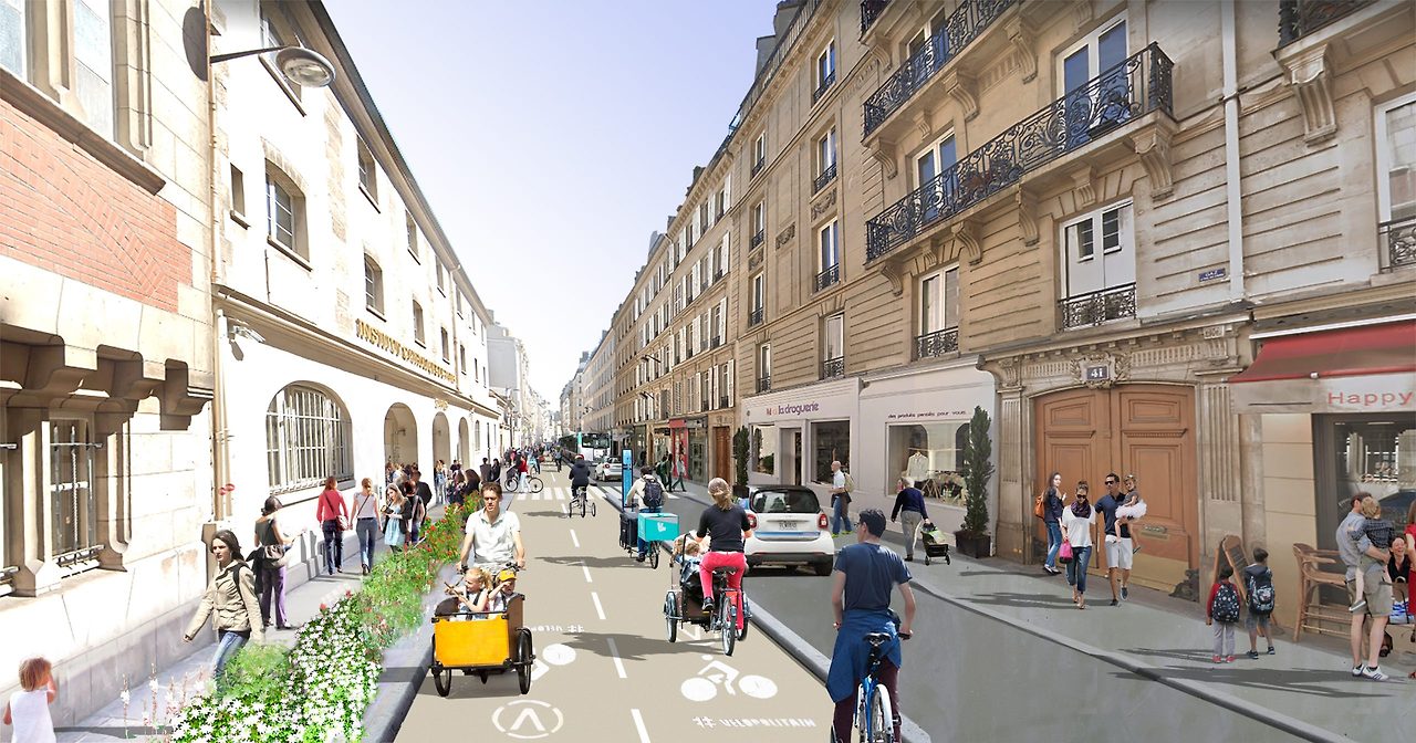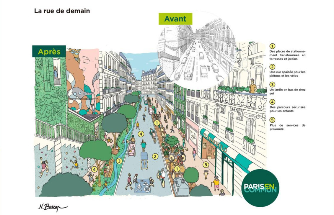 차들이 점령했던 도로들은 보행자 위주로 바뀌게 되는데요. 기존 주차면은 테라스나 작은 조경공간으로 활용되고(1), 중앙 도로는 자전거와 보행길로 사용되고(2), 집 앞의 작은 정원이 만들어지고(3), 어린이가 안전하게 다닐 수 있는 길이 생겨나고(4), 상점에서 쓸 수 있게 가게 앞 공간들을 만들어 주는(5) 이런 방식으로 변경되요. 최종 목표는 파리 시내에 자동차를 없애고 모든 시민들이 걷거나 자전거 또는 대중교통을 이용하는 것에 목표를 둔다고 합니다. 지금의 아름다운 파리 경관을 만든 오스만 시장 시대에 사람과 마차를 위해 조성된 거리는 지금까지 자동차들에 의해 불편하게 사용되다 다시 안 이달고 시장에 의해 사람을 위한 거리 본연의 모습을 찾아가는 중이네요.
