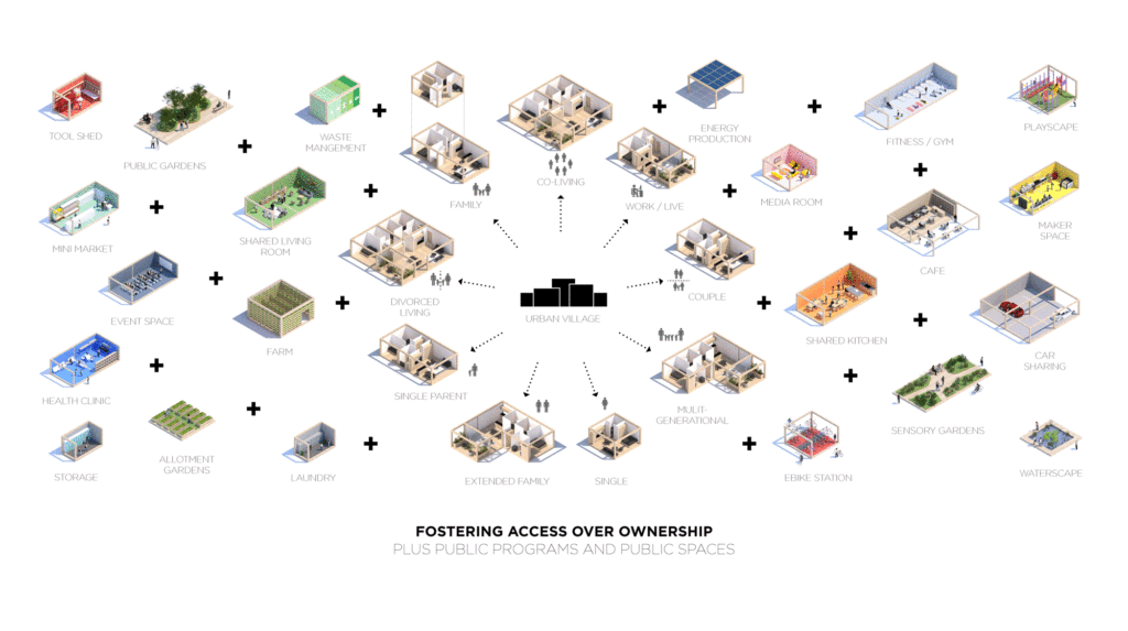 Urban Village Project는 우리 삶의 질을 향상하기 위해 미래의 집과 이웃과 도시를 설계하고 건설하는 방식을 제안하고 있습니다. 특히 모듈화된 조립식 설계와 시공으로 저렴한 집을 만들 수 있는데요. 단일 모듈을 확장해서 여러 가지 타입의 주거를 만들 뿐만 아니라 커뮤니티 시설도 모듈처럼 다양하게 만들어 조합하여 빌리지 만들기를 가능하게 합니다. 커뮤니티 시설은 모든 연령대 불특정 다수를 위한 공유기반 시설을 만드는 것으로 탁아소, 도시 농업, 공동 식사, 피트니스, 공유 교통과 같은 공유 시설 및 서비스 다양한 혜택을 통해 더 나은 일상생활을 가능하게 한다고 합니다.