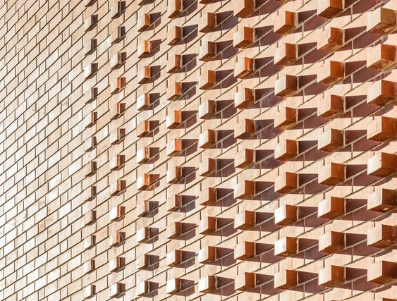 벽돌 한 장정도는 어린아이도 거뜬히 들 수 있습니다. 작은 상점, 작은 집같이 작은 재료를 쌓아 작은 건축을 한다는 생각도 틀리진 않지만, 연결철물의 도움으로 한 장 한 장 쌓아 하이라이즈 빌딩도 만들 수도 있는 것이 요즘의 벽돌입니다. 디테일적으로는 쌓기 방식과 줄눈의 색상에 따라 다른 느낌의 텍스쳐를 만들기도 하고 깊이가 다른 음영을 들이기도 하지만 결국 하나하나 쌓아 만든 매스감의 맛으로 벽돌을 씁니다. 심심해 보여서 다양한 쌓기 방식을 고민하지만 그런 디테일보다는 결국 한 장 한 장 손에 잡히는 벽돌이 모여 큰 덩어리를 만드는 스케일의 맛! 가장 작은 재료로 만들 수 있는 가장 웅장한 매스에 대한 기대도 가능하게 하죠.