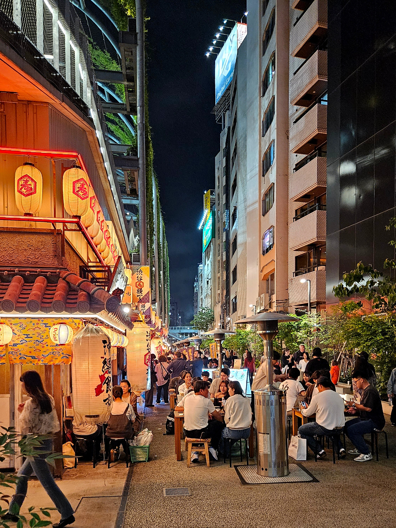 옥상 공원 아래 3개 층은 아웃도어 쇼핑몰로 구성되어 있어요. 상업시설의 이름은 레이야드 파크로 1층에는 루이뷔통, 구찌, Kith 등 명품 하이엔드 브랜드 대형 플래그십이 들어서 있어요. 다시 오프라인 매장으로 사람을 불러 모으는 전략으로 일본에 처음 상륙하는 해외 브랜드 매장이나 지역의 강호이지만 아직 도쿄에 진출하지 않은 매장, 이미 여러 곳에 입점해 있는 브랜드지만 실험적으로 기획한 플래그십 매장, 새롭게 기획해서 론칭하는 매장 등 매장선정 시 네 개의 암묵적인 공식이 깔려 있다고 해요. 접지층에서는 도로에 의해 북쪽 남쪽 블록 두 개로 나뉘지만 3층부터 연결되어 있는 구조로 테라스를 통해 대부분의 매장을 배리어프리로 연결하며 자연스럽게 옥상 공원까지 이어지는 구조예요. 그리고 뒷골목엔 시부야 요코초라는 식당과 술집이 있는데 기획의도는 시부야에서 약속을 잡을 때 첫 번 째 만남의 장소 역할을 하는 곳으로 설정했다고 해요. 요즘 요코초 인기가 살아나자 새롭게 요코초 스타일 테마푸드홀을 만들어 성공한 '하마쿠라 상점제작소'는 시부야 요코초도 기획하여 성공했다고 해요. 밤에 가보니 뒷골목 요코초는 직장인 회식이나 퇴근길 아재들이 점령할 것 같은 술집 느낌이 생각보다 덜했고 외국인 여행객과 가족 방문객들이 많아서 안전하고 건전해 보이기도 했어요.