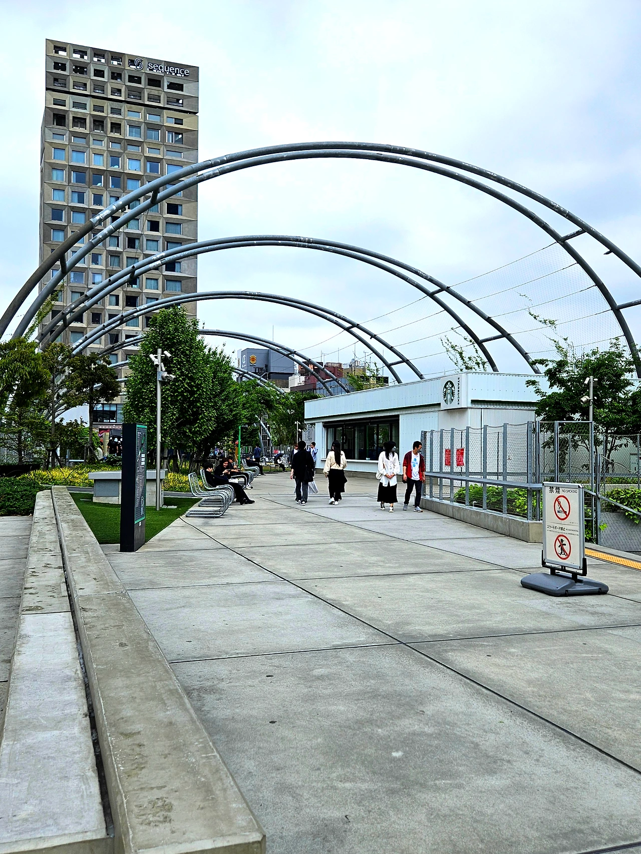 옥상에는 일본 스트리트 패션의 선구자인 '후지와라 히로시'가 기획한 유명한 스타벅스가 있어요. (충전이라는 컨셉으로 주유소와 커피 매장을 섞은 컨셉에 반했고, 너무 기대를 해서인가 생각만큼 확 느껴지지는 않았어요) 그리고 옥상에는 호텔을 공공공원에 접목한 일본 최초의 호텔이 있어요. 옥상에서 바로 호텔 로비와도 연결이 되는데 이 호텔이 레이트 체크아웃으로 기획된 시퀀스 호텔이에요. 옥상 공원의 면적은 약 1만 제곱미터로 출입과 활동이 자유롭게 허용되는 넓은 잔디밭과 스케이트보드장, 샌드 코트, 암벽 등반을 즐길 수 있는 볼더링 장 등 다양한 어반스포츠 시설을 갖추고 있어요. 특히 스케이트 보드장은 과거 버전의 미야시타 파크에서도 사랑받던 시설로 재개장 시에도 명맥을 유지했다고 해요.