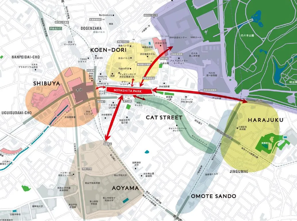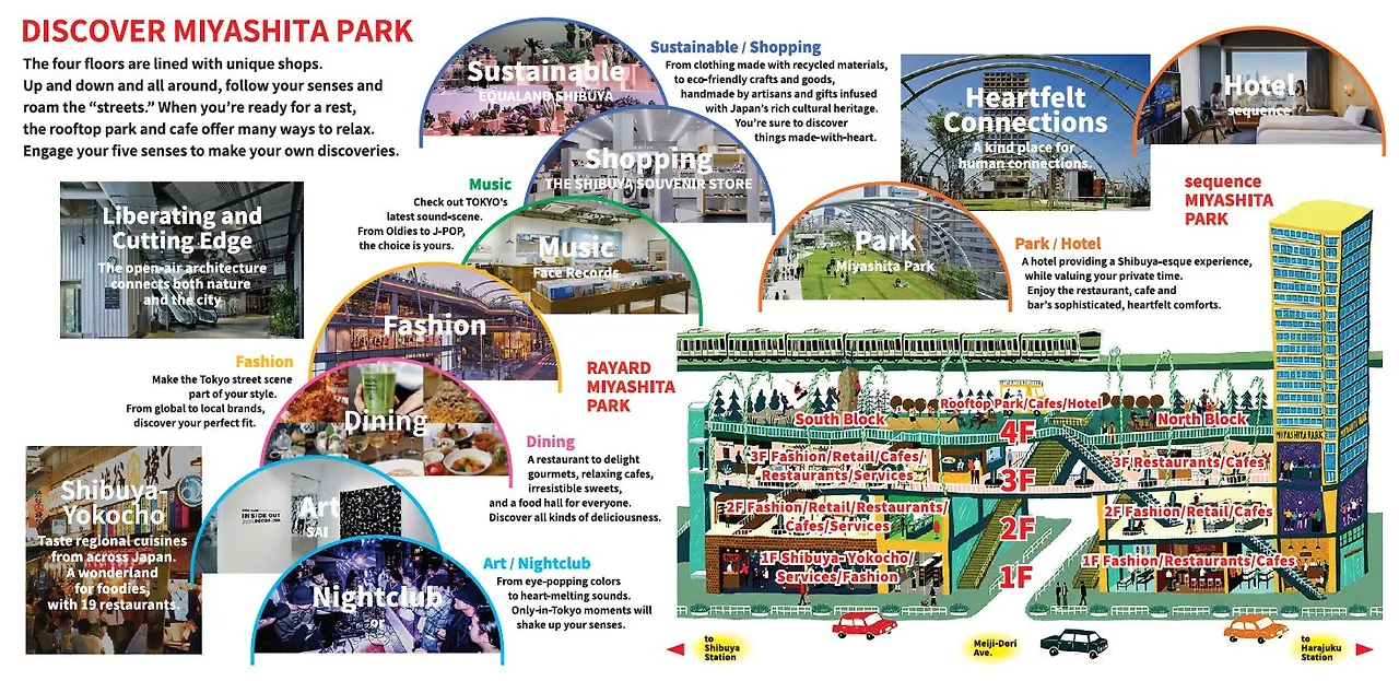 시부야는 도쿄 젊은 층의 쇼핑과 놀이의 중심, 엔터테인먼트 적인 요소가 가득한 매력적인 동네라고 해요. 유행의 중심지로 발전하는 시부야 그 중심에는 도큐부동산이 있었어요. (다음에 시부야 그레이터에 대해 이야기할 예정이지만 시부야는 도큐부동산이 개발한 건물들이 군집한 도심이라 할 수 있어요.) 도큐는 도큐키즈라는 말이 있을 정도로 도큐 철도를 생활기반으로 하는 사람들이 새로운 유행과 그들만의 문화를 발전시켰기며 시부야를 키워갔어요. 이렇게 도큐의 구역인 시부야에 이례적으로 미쓰이가 완성한 미야시타 공원이 생긴 셈이에요. 미드타운을 개발한 미쓰이는 도큐색이 짙은 시부야에 공모사업권을 획득하며 출사표를 던졌어요. 미쓰이는 시부야에 새로운 형태의 랜드마크를 기존에 있던 공원을 재개발해 옥상으로 올리고 그 아래 주차장과 상업시설 그리고 미쓰이가 론칭한 새로운 호텔까지 넣어 복합개발을 했어요. 미쓰이는 시부야와 오모테산도의 접점에 새로운 도시여행객과 소비자를 타깃으로 시부야구와 함께 미야시타 파크를 만들어 갔어요.
