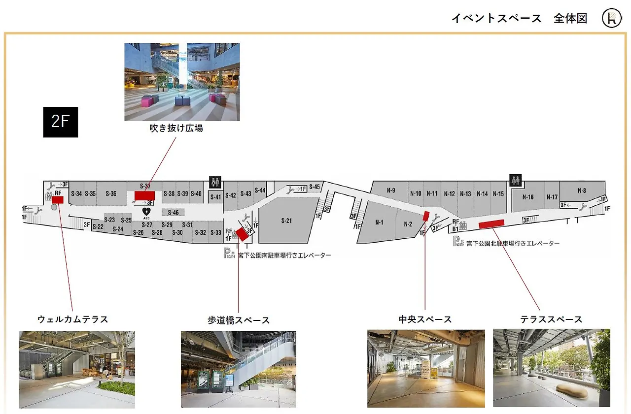 코어와 연결된 다섯 군데 이벤트 스페이스. 좁고 긴 태생적인 형상 때문에 어쩔 수 없었을까. 조금 더 공원을 상업시설에 흩뿌렸으면 어땠을까 ⓒ미쓰이부동산