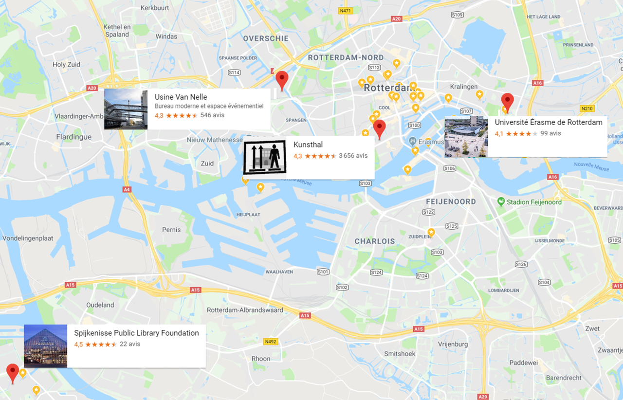 로테르담 중심가에서 반 넬레 팩토리는 9시방향, 에라스무스 대학교는 3시방향, 스파이크니스는 로테르담 중심에서 전철로 30분 정도 걸리는 멀지 않은 곳으로, 로테르담에 머무르며 반나절 다녀오기 좋은 곳입니다.