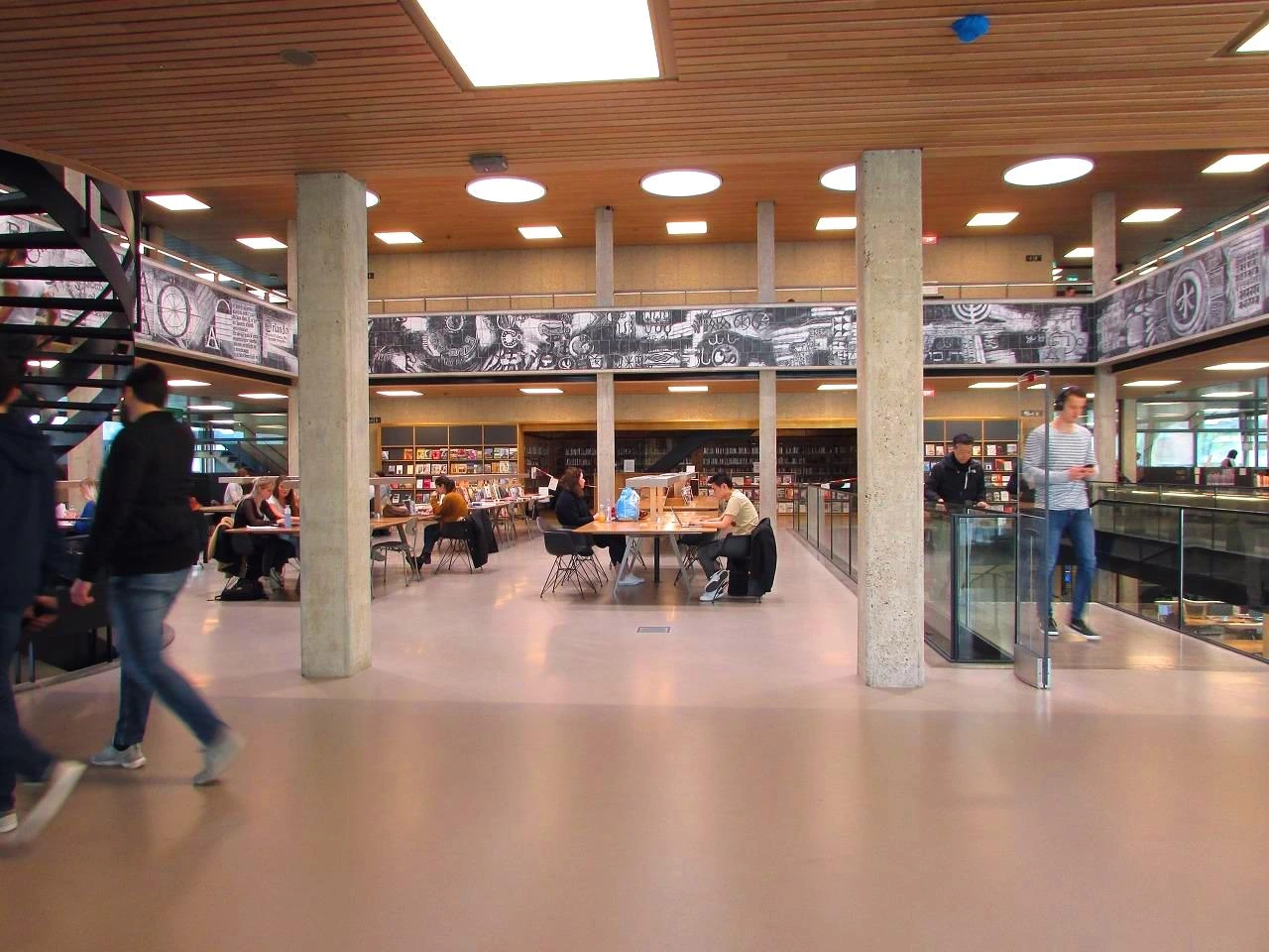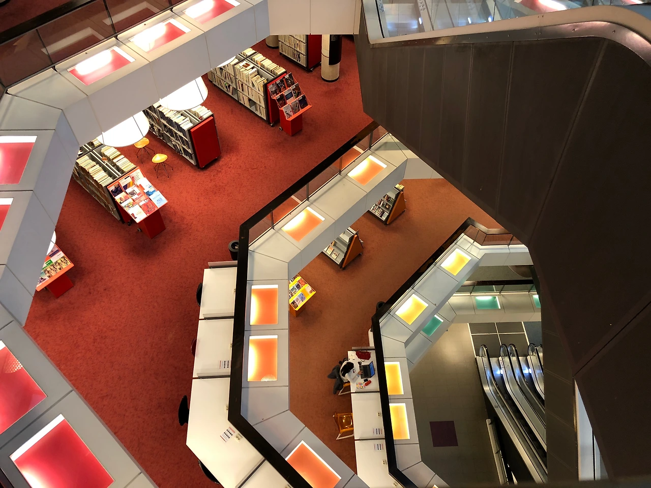 1층에서 에스컬레이터를 타면 연속적으로 올라갈 수 있는 구조 1977년 당시에는 파격적인 도서관 공간이었을 듯 ⓒ JIN
