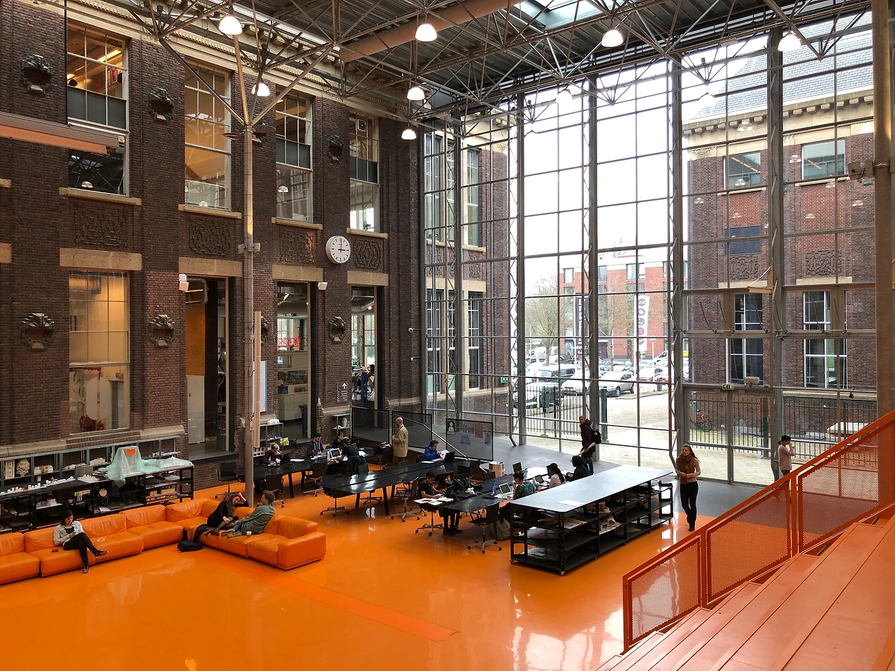 델프트대학교 건축학과 건물은 2008년 5월 12일 화염에 휩싸여 그간 보유하고 있던 수많은 논문과 자료가 함께 소실되었고 건물은 철거되었다고 합니다. 건축학과의 각 스튜디오는 새로운 건물을 마련하기 전까지 임시 거처를 마련하기 위해 오래된 델프트 공대 본관 건물을 리노베이션하고 스튜디오별 공간을 자율적으로 배분해 수업을 진행하고 있습니다. 3개 동 건물이 ㄹ자 형태로 연결되어 있고 작업공간, 모형 제작실, 카페와 맥주를 마실 수 있는 곳까지 모두 구비되어 단순히 건물이라는 호칭을 넘어 BK CITY라고 불리고 있습니다.