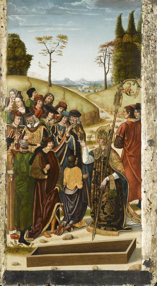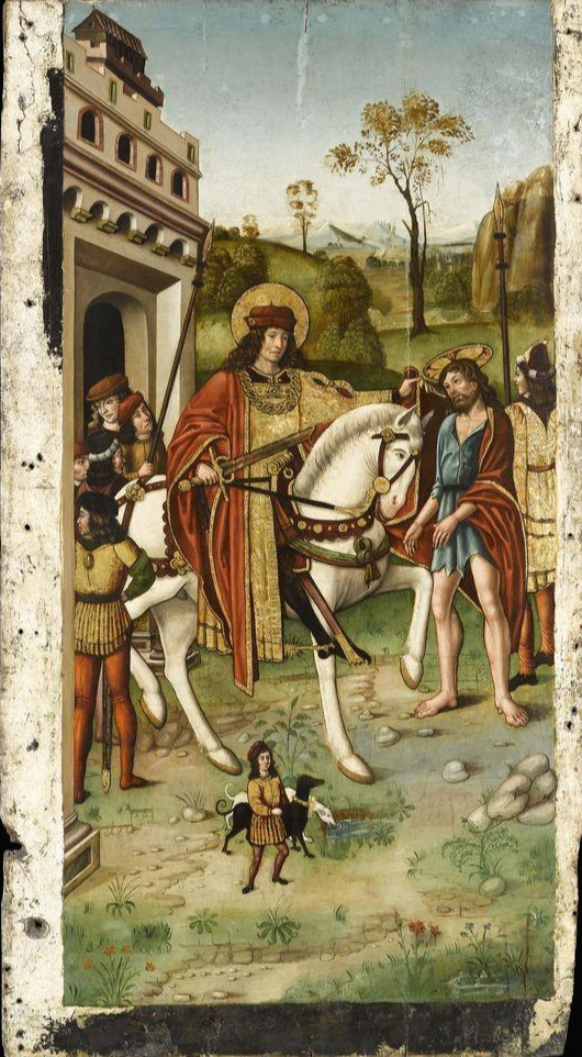 때는 355년, 유난히 추운 어느 겨울 밤. 군인 마르티노는 아미앵 성문 앞을 말을 타고 지나가다 벌거벗은 채 추위에 떨면서 구걸하는 거지를 만났다. 그가 가진 것은 입고 있던 외투와 허리에 찬 무기뿐. 마르티노는 자신이 걸친 외투를 벗어 칼로 긴 신문지 자르듯 두 동강을 낸 후 한쪽을 거지에게 건네주었다. 그날 밤 마르티노는 꿈속에서 반쪽짜리 외투를 입은 예수를 만났다. 예수는 사람들 앞에서 마르티노를 가리키며 "마르티노가 나에게 외투를 입혀 주었다." 라고 말했다.