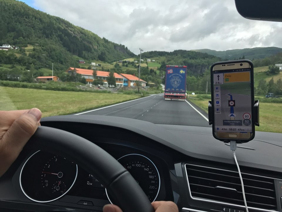 나는 운전하며 마실 요량으로 1.5 리터짜리 생수 이즈브레(Isbre)를 네 개들이 묶음으로 하나 샀다. 신용카드는 잘만 들었다. 역시 아까는 통신이 말썽 부린 모양이었다. 차를 출발시켰다. 아내와 아들은 까무룩 잠에 떨어졌다. 얼마나 달렸을까. 베르겐에 거의 다 왔는데 "부르륵" 하고 휴대폰이 흔들렸다. 휴대폰 화면 상단에 한 줄 문장이 오른쪽에서 왼쪽으로 흘렀다. 휴대폰을 구글 네비로 쓰느라 운전석 앞 유리에 거치대를 붙이고 올려놔서 문자가 들어와 '북북' 대면 신경이 쓰였다. 대리운전 광고나 바다 이야기 스팸은 아니었다. 마침 연료 게이지도 바닥에 가까워 눈에 보이는 에쏘(ESSO) 주유소에 차를 댔다. 문자는 뢸달스테라센에서 보낸 거였다.