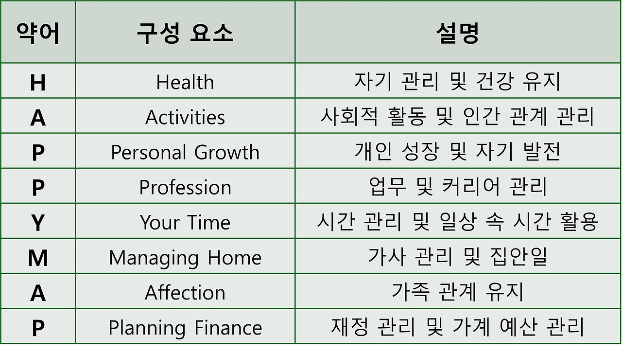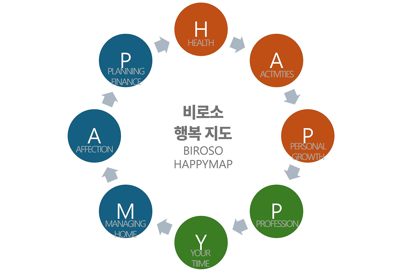 이제는 나의 하루 24시간을 어떻게 구성하고, 어떤 관계 속에서 살아갈지 고민해 보고 있다. 내 경험을 담아 ‘비로소 행복지도(HAPPYMAP)’라는 이름으로 8가지 키워드를 정리해 보았다. 이 행복지도는 건강, 인간관계, 커리어, 자기 계발, 시간 관리, 가사, 가족 관계, 재정 관리의 8가지 요소를 담아 앞으로의 삶을 더 주체적으로 그려나가려 한다.