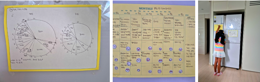 냉장고에 매주 붙이는 주간 계획표에 우리 가족 식단 계획, 가족의 주요 일정, 각 가족 구성원의 일정을 확인할 수 있다. 각자의 중요한 일을 챙기기도 하고 그에 맞춰 다른 가족 시간을 조정하기도 한다. 아이의 학교 받아쓰기 100점, 독서노트 20권 달성, 태권도 승급 등의 소소한 일정과 그 성취를 축하하는 외식도 계획한다. 아이가 공들인 시화전 공모에서 낙선한 날에는 엄마아빠표 상장을 만들고 수여식을 하기도 하였다. 엄마표 공부는 학원수강증을 만들어 매일 공부후에 도장을 찍어준다. 엄마는 원장, 아빠는 회장님이라 한달 20번 공부하면 만원의 보너스 용돈을 주기로 했다.