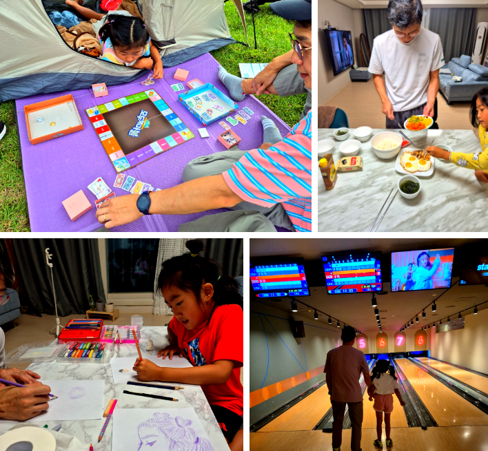 캠핑장 글램핑, 전시회 관람, 카페에서 독서 놀이 등 아이의 생각과 시야가 넓어질 수 있는 경험을 함께하는 시간을 가지려고 한다. 대규모 상업시설, 문화콘텐츠 관람, 문화유적 탐방 등 엄마아빠표 문화체험을 기획하고 가까운 곳에서 짧은 시간이라도 기분 전환을 할 수 있는 기회를 만들려고 한다.