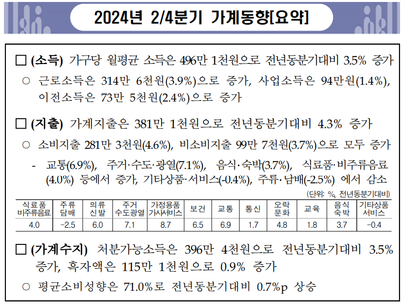 통계청이 내놓은 2024년 2/4분기 가계동향조사에 따르면, 우리나라 가계 평균 수입은 496만 1천 원, 가계 지출은 381만 1천 원으로 나타났다. 소득과 지출 모두 전년 동분기 대비 3-4% 정도 증가하였다. 소득의 경우 근로소득, 사업소득, 이전 소득으로 파악되고 소비 지출은 교통, 주거/수도/광열, 음식숙박, 식료품비주류음료 등에서 증가하였고 주류담배항목은 감소하였다.