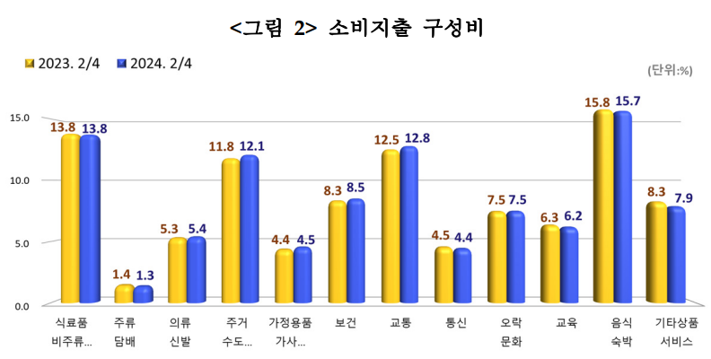 가계지출의 구성비를 들여다보면 식료품이 13.8%, 주거수도등이 11.8%, 교통 12.5%, 음식 숙박 15.7%로 나타났다.