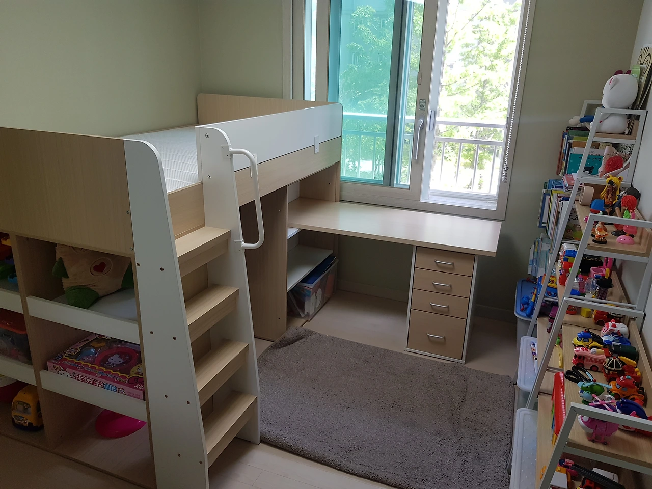 우리 부부는 폭풍 검색을 한 후 아이가 학교에 들어가서도 잘 쓸 수 있을만한 벙커형 침대를 골랐다. 위쪽은 침대로 쓰고 아래쪽은 수납공간과 책상이 연결되어 좁은 방을 효율적으로 쓸 수 있는 디자인이었다. 침대 아래 공간을 아지트처럼 꾸미고 책상에서 한글공부도 하고 책도 읽으면서 공부 습관을 좀 만들어볼 생각도 들었다.