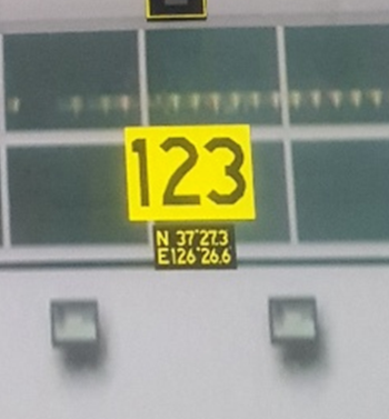 김포공항에 14번 게이트의 좌표 표지판. 조종사들은 사용하는 좌표는 N37 33.5 E126 48.1로 형식이 다르다.
