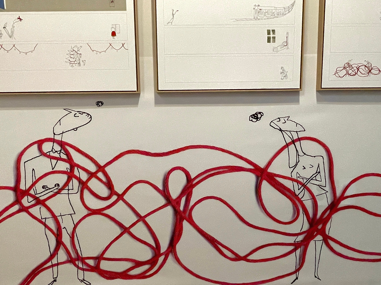 -세르주 블로크의 이번 전시 주제는 ‘사랑’이다. 아주 오래전 <신사의 품격>에서 장동건과 김하늘이 만나는 첫 장면의 붉은 실, 그리고 동화책 <나는 기다립니다> 읽는 장면으로 단숨에 베스트셀러가 된 명작의 일러스트레이터다. 복잡하게 얽히고설킨 인간의 이야기를 가장 단순한 한 가닥 실로 풀어낸 작가.