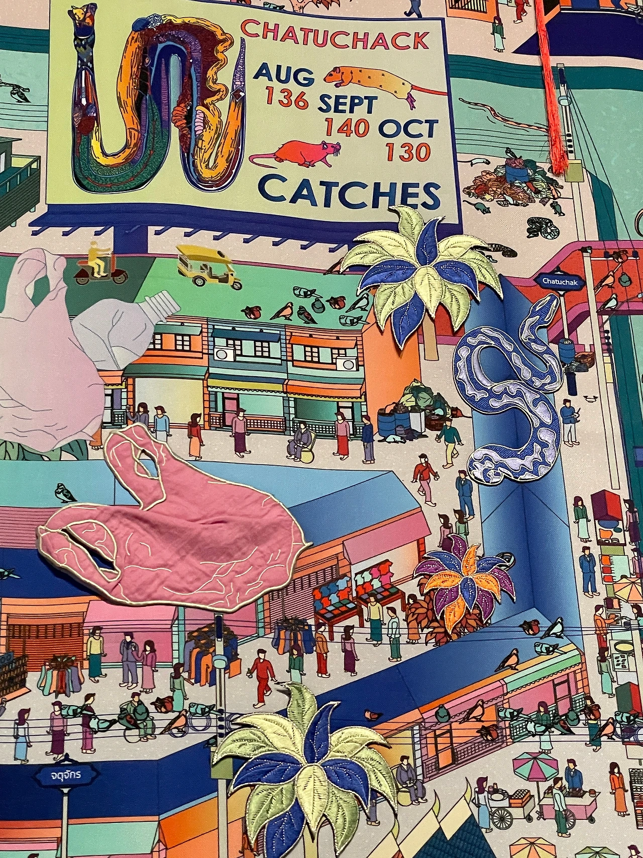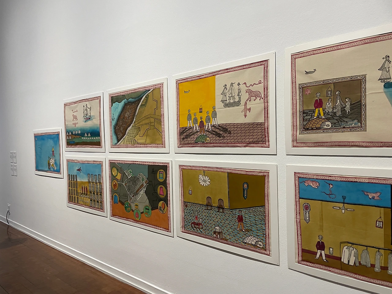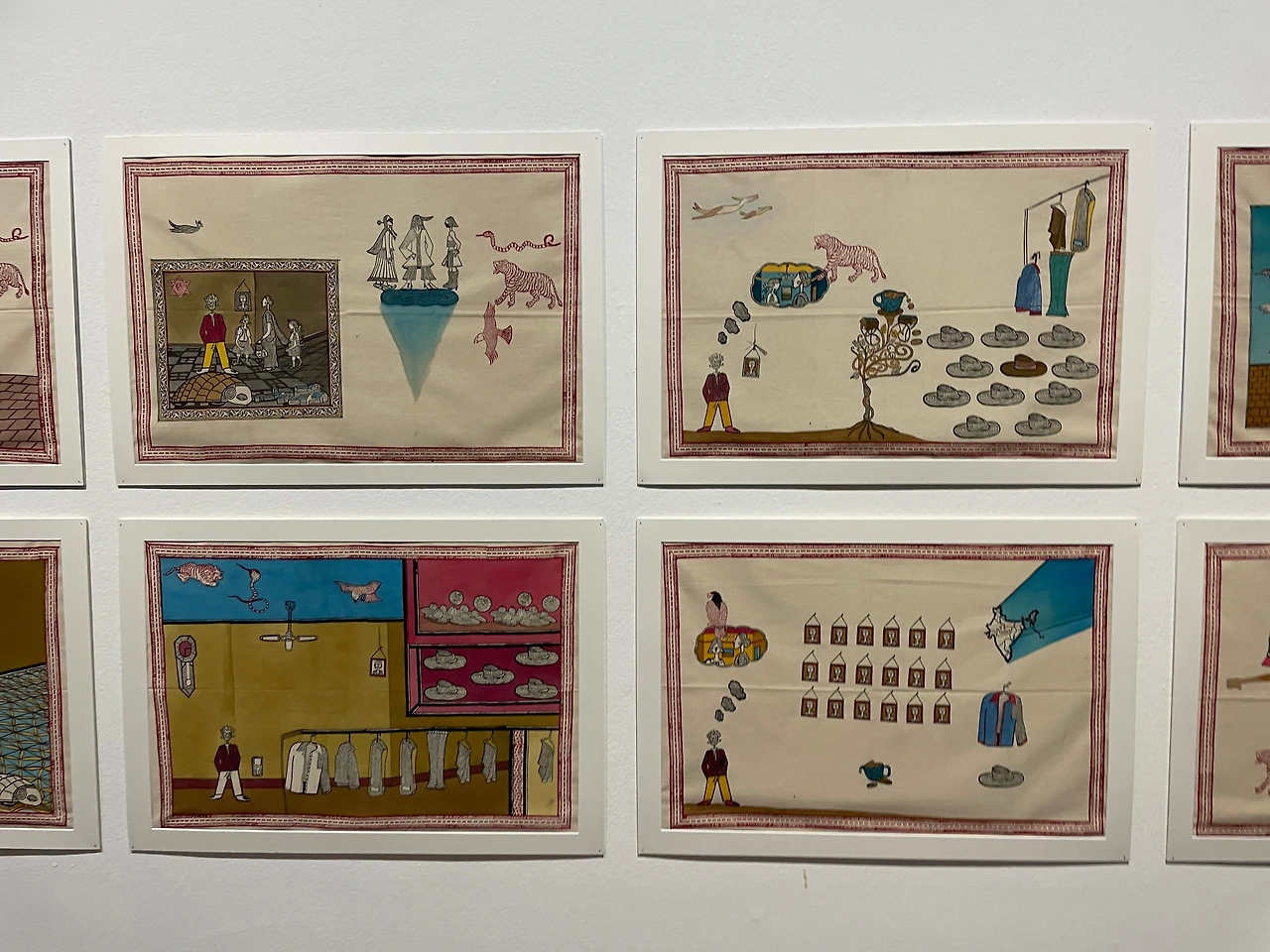 -작품은 패브릭에 목판으로 찍어내어 채색했다. 강렬하면서도 섬세한 라인과 장식적인 인도 우드블록이 매력적이다. 시리즈로 이어지는 그림이 종교의 교리를 전달하는 그림처럼 느껴지기도 하고. 점차 세계화가 진행되어가면서 우리 모두 한 번씩 봐야하는 현대판 행실도랄까.