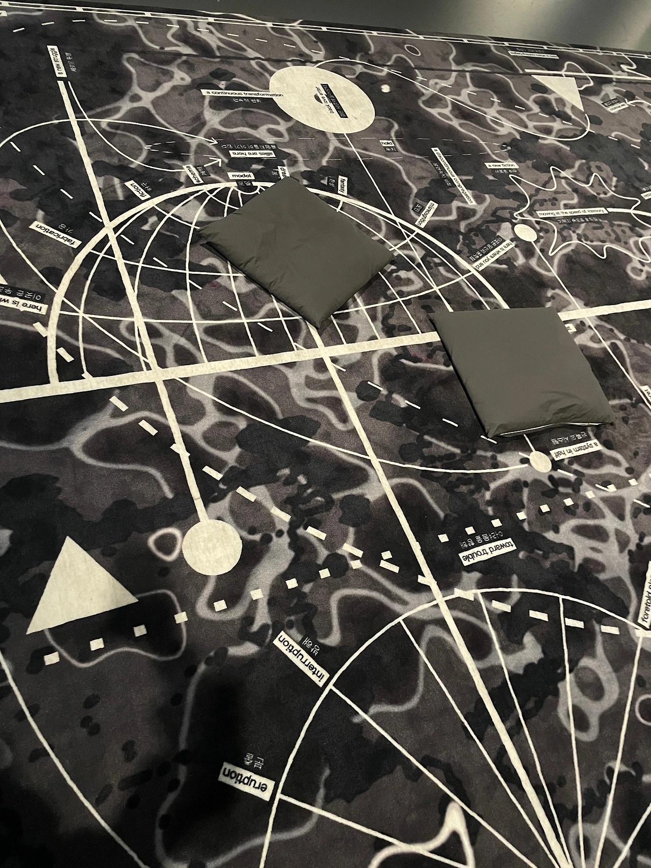 -이번 비엔날레는 우리 삶을 규정하는 국경, 정체성의 문제를 직시하며 서구 열강의 전쟁에서 땅따먹기처럼 만들어진 지도가 말하는 합리성, 명확성에 반기를 드는 작품들이 모여있다. 얼마 전 국립현대미술관에서 봤던 정연두 작가의 <백 년 여행기>가 문득 생각나기도 했다. 디지털뿐 아니라, 직조, 조각, 3D프린팅, 사막 환경에서 건축재료로 사용되는 어도비 점토 등 다양한 매체를 통해 디아스포라, 이주, 도시와 국가의 경계에서 자의 혹은 타의로 그곳을 떠나야 했던 사람들의 이야기를 전달한다.