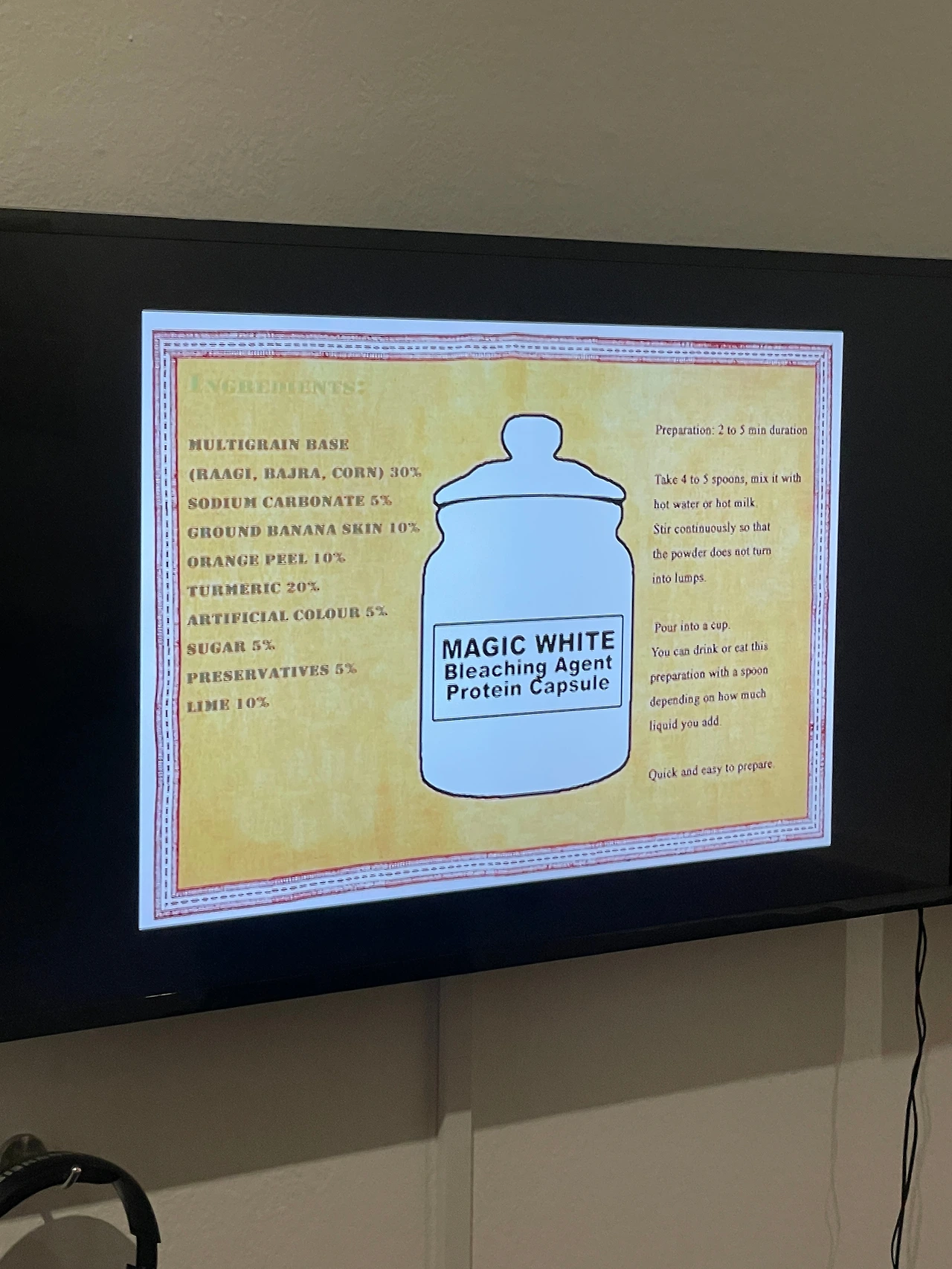 -이 약품은 인도에 뿌리 깊게 이어져 온 사회 계급과 연관된 인종 문제를 단순히 밝은 피부를 통해 해결하려는 얄팍한 의도를 반영한다. 아주 웃기고도 슬픈 사실은 만일 실제로 제품이 존재한다면, 이 황당한 약이 팔릴지도 모르겠다는 생각이 들었다. “만약 당신이 다라비에 살고 있는 임신한 여성이라면, 이 약을 먹어서 문제를 해결할 거야?”라고 남편에게 물어봤더니, 그렇게 해서 계급을 흔들어야 하지 않을까? 라는 이야기를 했다. 마지 조선 후기부터 너도나도 족보를 사고팔면서 계층의 사다리가 흔들리기 시작한 것처럼.
