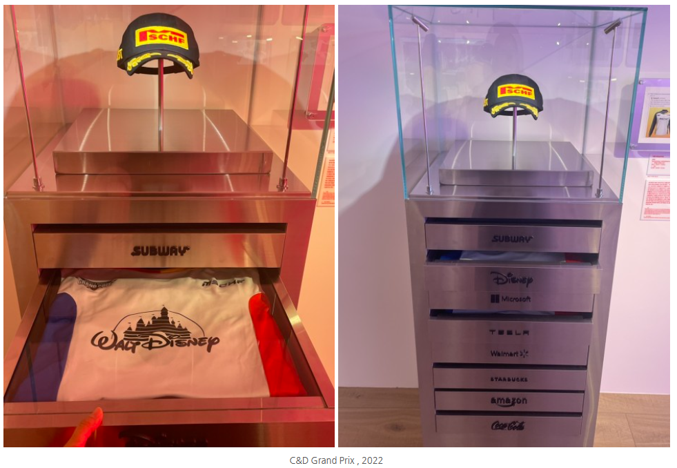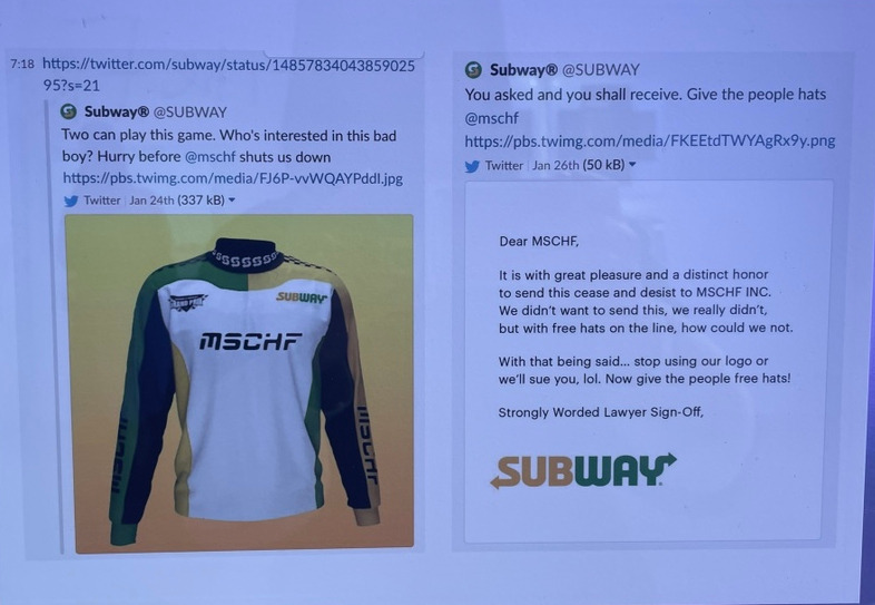 -C&D(미국의 특허권 침해 중단 요구 경고장) 받는 것을 즐기며 인터넷과 바이럴을 똑똑하게 이용해서 대중의 인식을 뒤흔드는 동시에 흥미도 전달하는 작품들이 신선하다. 아마 미국인이었으면 나도 모르게 참여하고 있었을 듯. 코카콜라, 디즈니, 아마존, 테슬라, 써브웨이, 마이크로소프트, 월마트, 스타벅스의 지식 재산권을 의도적으로 침해하는 8개의 레이싱 저지를 제작하고 판매했으며, 이 중 미스치프에게 제일 먼저 C&D를 발송하는 기업이 이 게임의 우승자가 되고, 우승하게 된 회사의 저지를 구매한 사람들에게는 F1 챔피언 모자를 본뜬 우승자 모자를 추가로 증정했다. 당연 디즈니겠지? 생각했는데 아니었다.