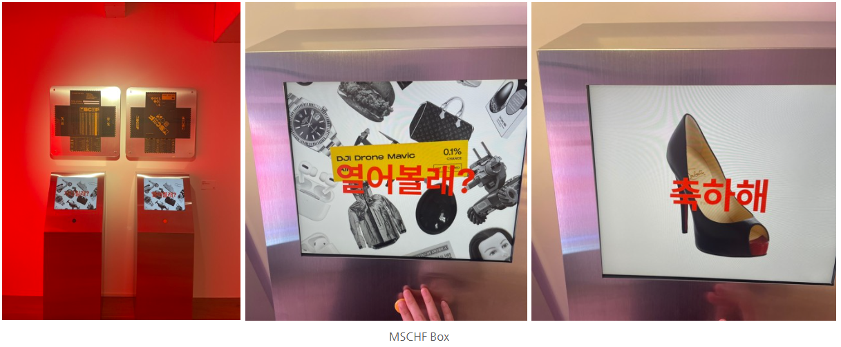-첫 번째 아카이브를 지나 MULTIPLAYER 섹션에서는, 정치, 사회, 경제, 투자 등과 같은 이슈들에 블랙 유머를 가미하여 제작한 신종 게임들을 전시해놓았다. 미스치프가 비판하는 지점들을 뭔지 알면서도 아주 즐겁게(?) 참여했다. 특히 인상깊었던건 100달러에 구매할 수 있는 정육면체의 랜덤박스다.