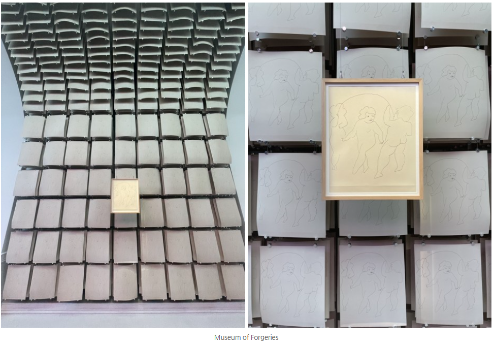 -워홀의 진품 1점과 나머지 복제품 999점으로 워홀의 작품일 수도 있는 1,000점의 에디션도 인상적이다. 계속해서 복제하고 위조하다 보면 원본도 파기되어 위조품이 된다는 내용, 그리고 인쇄물 또는 쉽게 복사 가능한 작품을 제품화하면 각각의 가치는 줄어들지만, 전체적인 수익이 증가한다는 내용. 그걸 한눈에 들어오도록 설치했다.