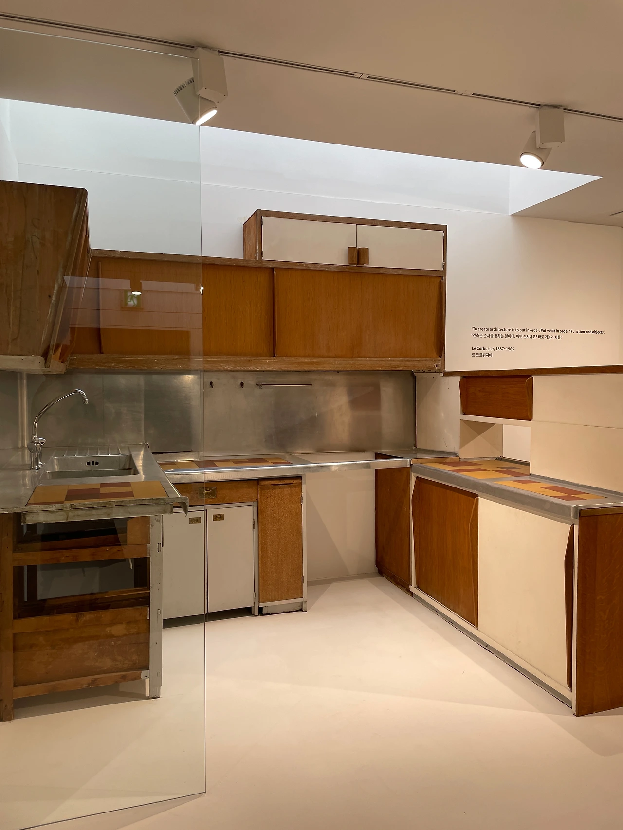 -페리앙과 르코르뷔지에는 공간을 절약하기 위해 수납장에 개폐식 슬라이딩 도어를 사용했으며, 상부장 내부에 팬이나 냄비 같은 조리도구를 걸 수 있도록 냄비 걸이를 만들었다. 다른 편의 조리대는 비교적 낮은 키로 제작해 개방감을 꾀했다.
