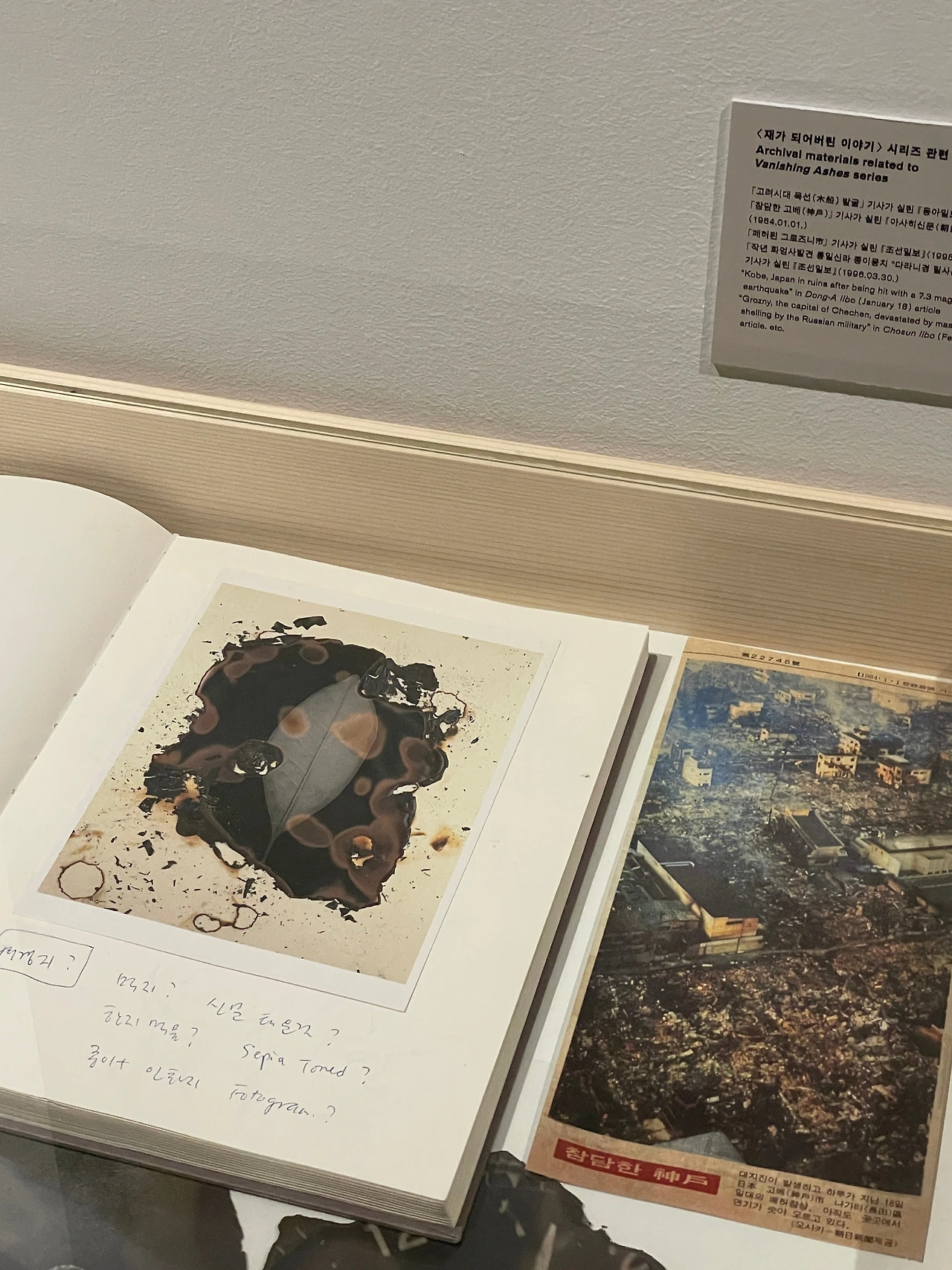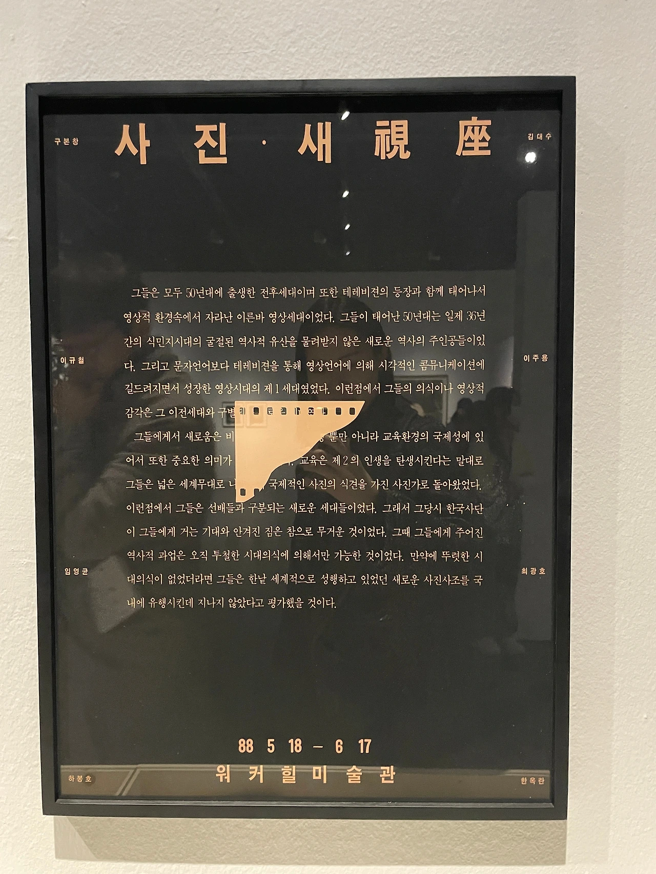 작가는 명문대를 졸업하고 대기업에 입사 했지만, 1979년 독일 함부르크 국립 조형 미술 대학에서 사진을 공부하고 85년에 귀국했다. 한 작가의 회고전을 볼 때면 책을 읽는 것보다도 더 입체적으로 작품세계를 경험하고 올 수 있다. 영사기에 돌아가고 있는 필름 사진 중 유리창에 비친 대상을 포착했던 작품에 눈길이 갔다. 어딘가에 반사되어 보이는 대상의 모습은 꼭 낯선 곳에 자리한 이방인 같은 자신의 모습을 나타내는 것 같기도 했다. 작가의 대학 시절 과제물과 편지를 보면서, 안정적으로 자리 잡은 한국에서 탈피하여 새로운 여정을 시작하는 과감함과 열망을 간접적으로나마 체험했다.