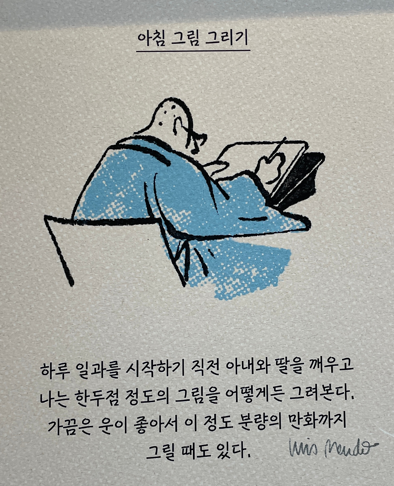 전시를 보고 책을 읽으면서 다른 작가의 이야기를 알아가는 것이 재미있는 이유는, 어쩔 수 없이 나의 상황과 빗대어 생각하기 때문일 것이다. 끊임없이 나, 그리고 나와 연결된 세계를 알아가는 즐거움을 드로잉 에서도 찾아봐야지. 오늘부터 일정 시간을 떼어 끄적끄적 그려야겠다.