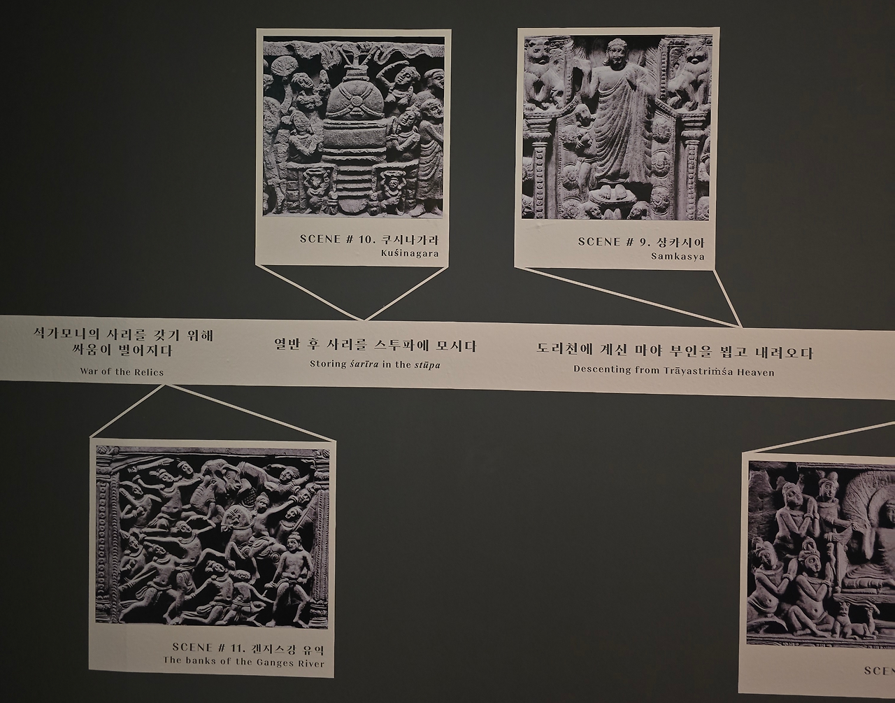 석가모니의 이야기를 스투파로 장식하는 방법은 한 장면에 여러 사건을 기록하기도 하고, 시간 순서대로 따로따로 배치하는 방법도 있다. 아래는 스투파를 돌면서 보듯이 오른쪽에서 왼쪽으로 보면 석가모니의 인생 이야기를 순서대로 살펴볼 수 있다.