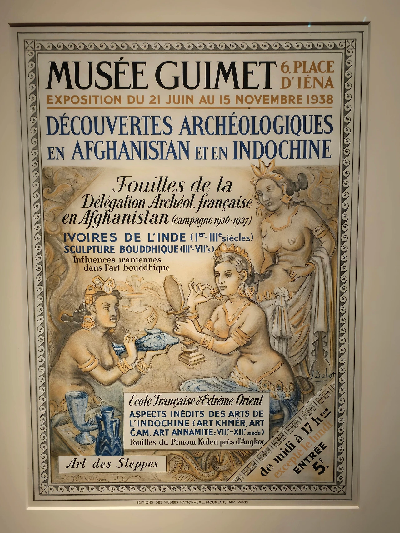 큐피트 장식 손잡이, 페르세우스와 안드로메다를 새긴 원판(왼), 날개 달린 사자 기둥장식 (가운데) , 인도 불교사원지를 발굴기념 파리 기메박물관 포스터(오)
