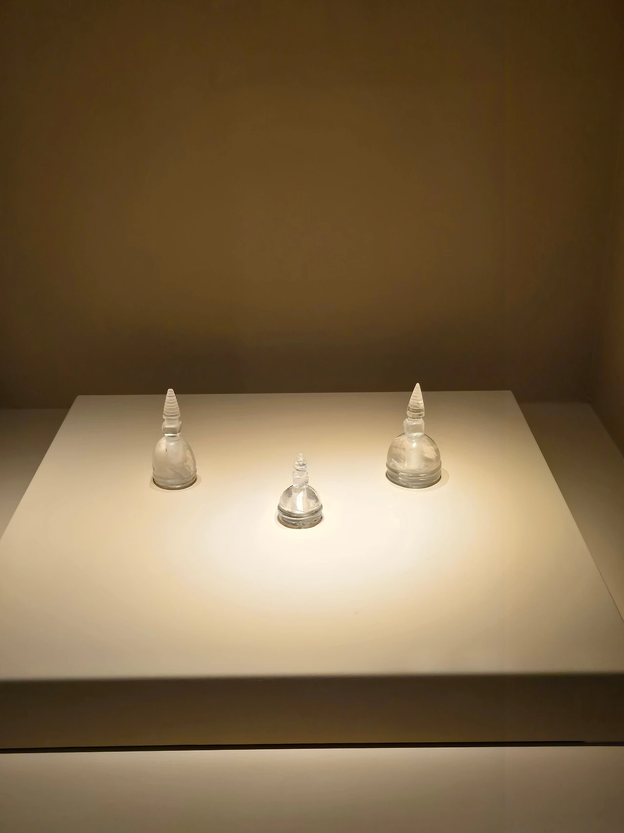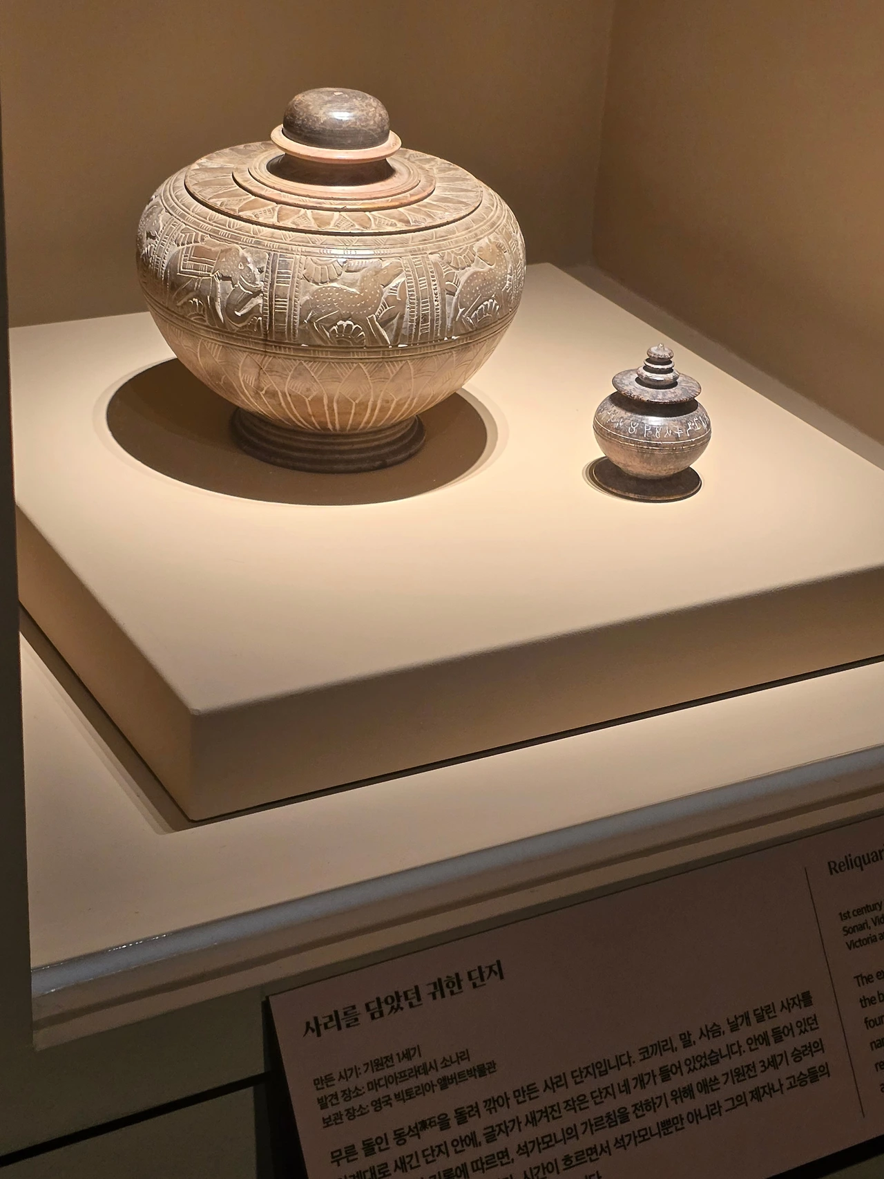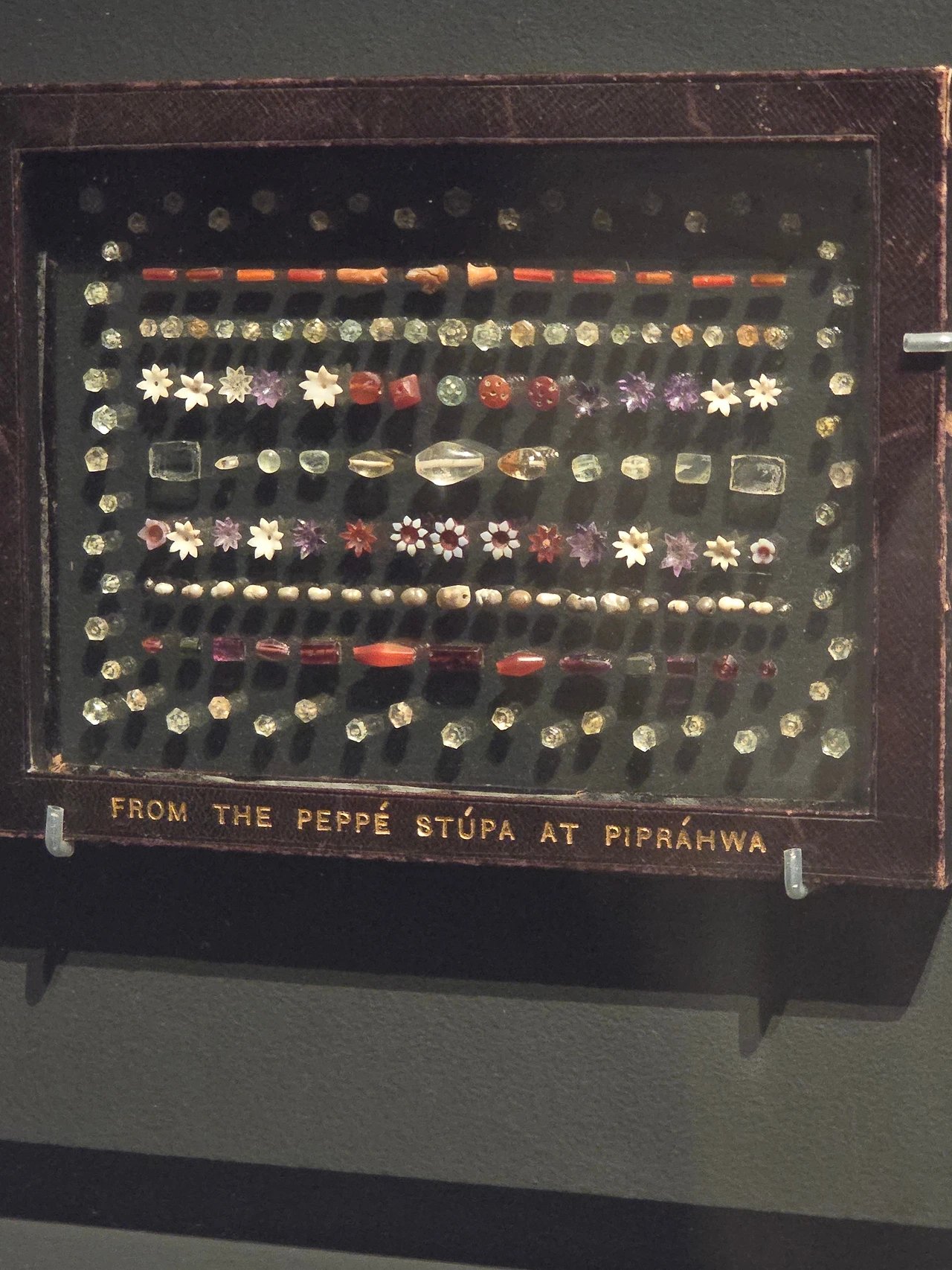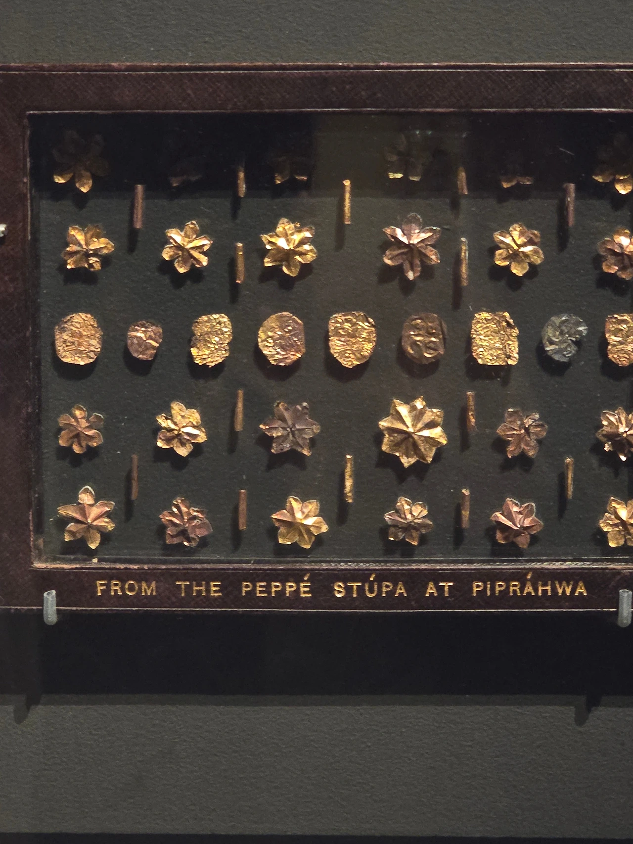 전시된 사리는 네팔과 국경을 맞댄 북인도 피프라와 스투파에서 출토된 것이다. 여기에서 발견된 사리 단지 안에서는 유골과 함제 금이나 진주, 꽃 모양으로 만든 보석이 들어 있었다. 이는 아소카왕이 나중에 석가모니의 사리를 꺼내어 다시 나눌 때 넣은 보석으로, 사리와 똑같이 귀중하게 여겨졌다.