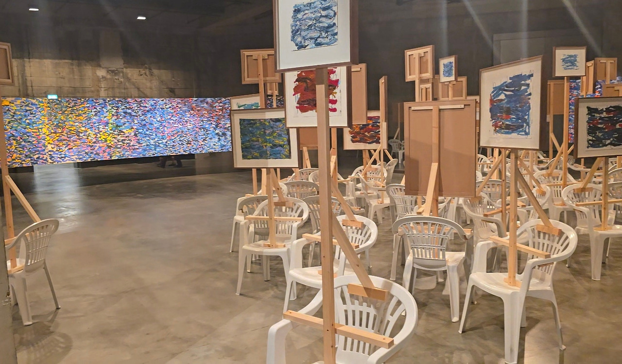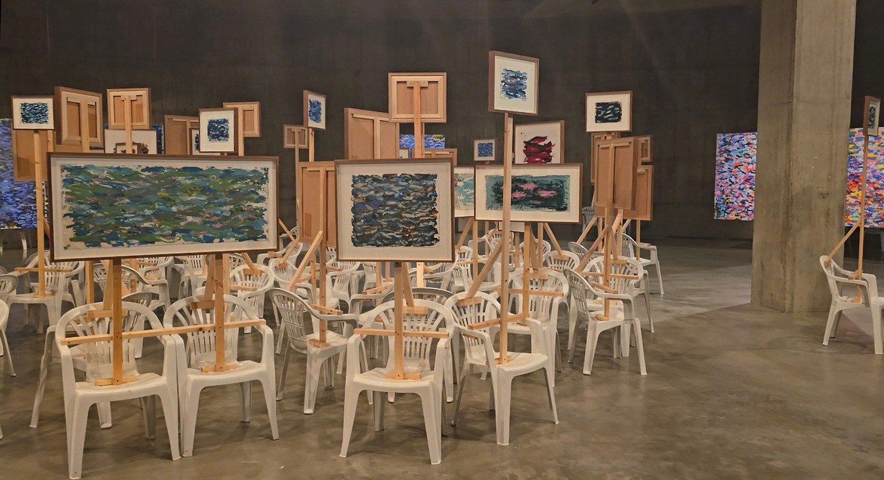 이어서 전시장 가운데부터 가장자리까지 플라스틱 의자 위에 나무로 설치된 작은 크기의 작품이 눈에 들어왔다. 강렬한 붉은 색이 줄줄 흐르는 물결부터 푸른색, 녹색 계열 등의 잔잔하거나 거친 수면이 일렁인다. 붓 터치 흔적이 여러 방향을 향해 있는 모습을 보면서 작가가 하고 싶은 말을 잔뜩 표출하고자 하는 것처럼 느껴졌다.