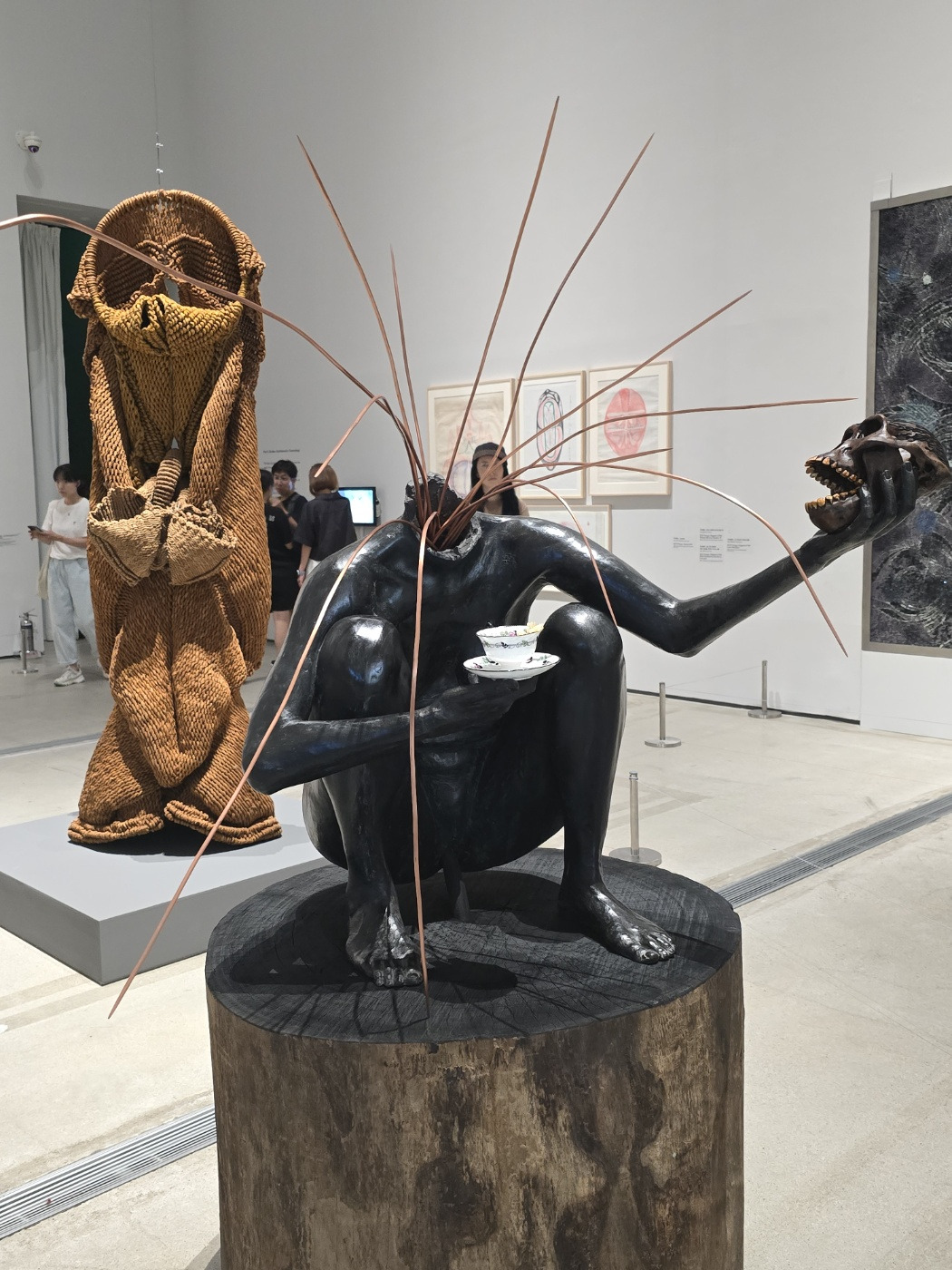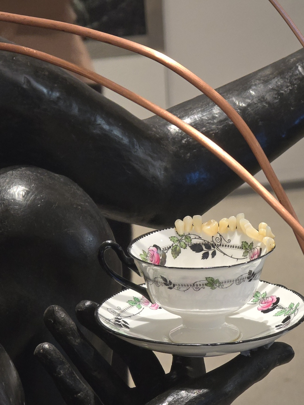 ‘신체.(여)신, 우주론’에서 ‘여신’의 이미지는 인간, 괴물, 동물, 알 수 없는 유기체가 버무려진 혼성체로 나타난다. 바티 커<그리고 자비로운 자가 잠든 내내> 또한 그중 하나다. 목이 잘린 신체가 한 손에 해골, 다른 손에 찻잔을 들고 있으며, 찻잔에는 치아가 달라붙어 있다. 목에서 피 대신 구리 선이 뿜어져 나오는 이 그로테스크한 형상은 인도 여신 칼리의 형상인 친나마스타의 상징성을 담고 있다. 친나마스타는 스스로 머리를 자르는 여신으로, 파괴와 재생의 상징이다. 이 작품은 그 상징성을 통해 인도 여성이 겪는 억압과 저항을 표현한다. 또한 칼리가 가진 파괴의 힘이 결국 새로운 가능성으로 이어진다는 것을 알리는 듯하다.