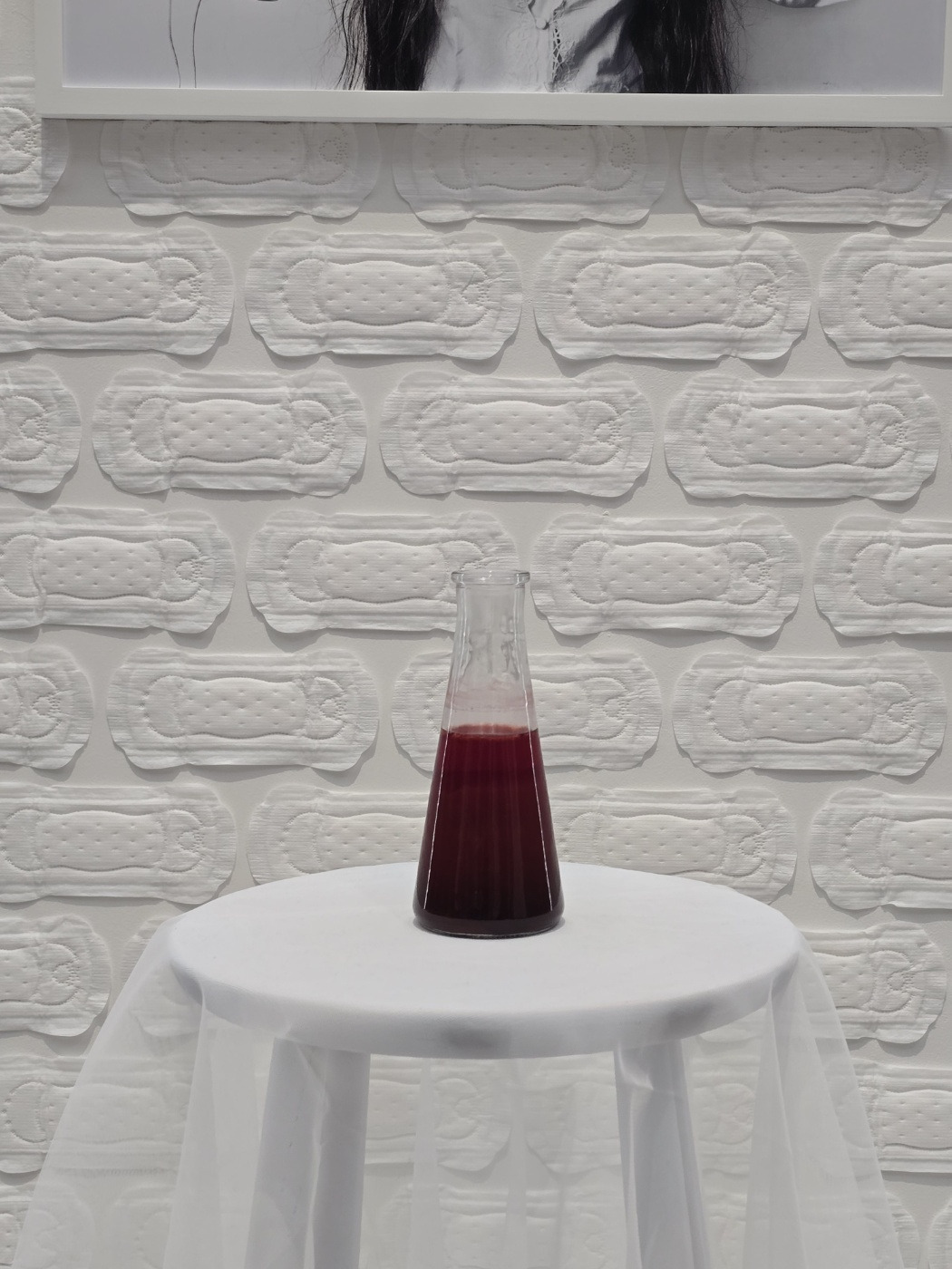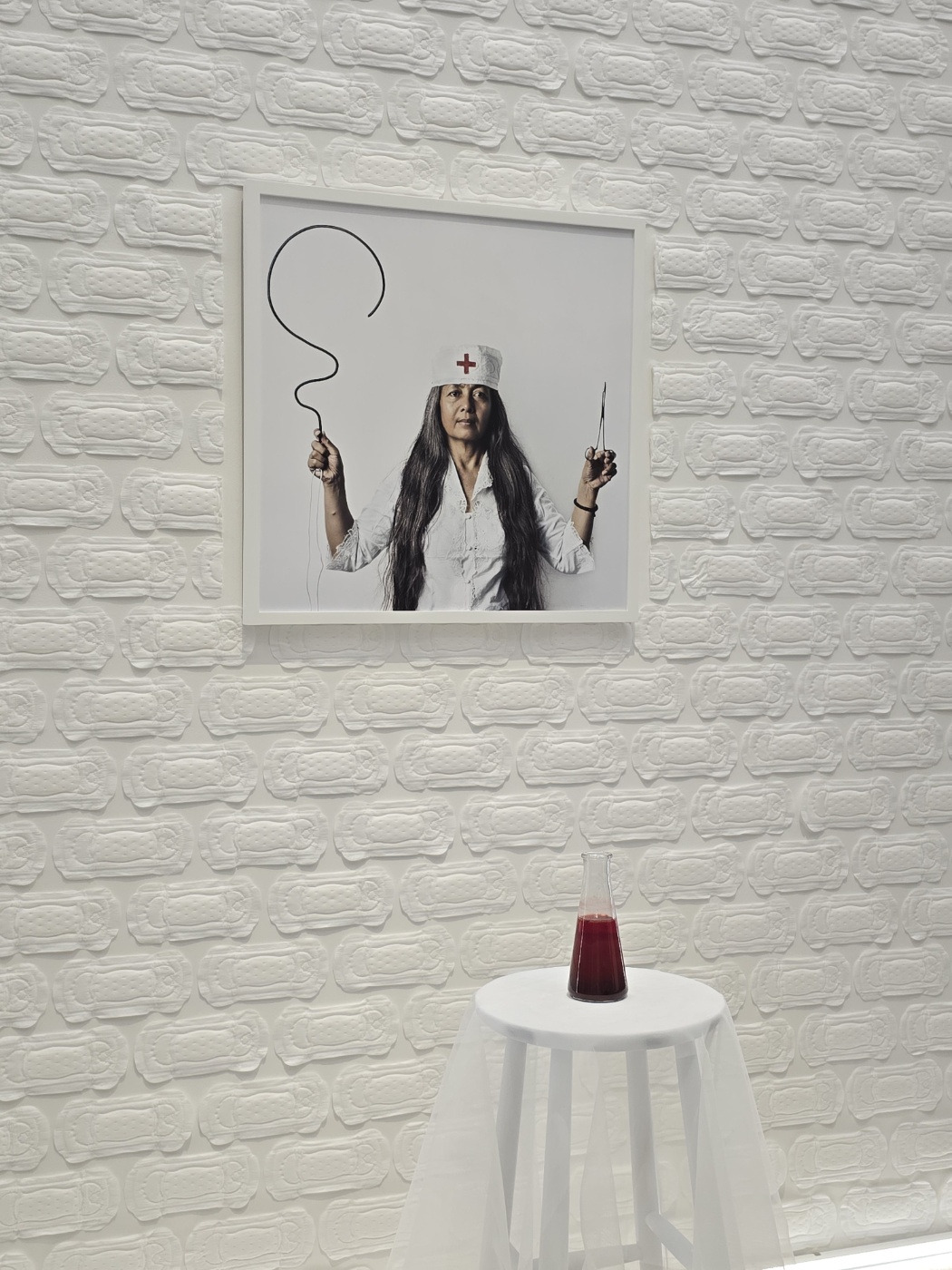 하얀 천으로 덮인 의자 위에 붉은 액체가 담긴 병이 있다. 진짜 피일까? 그리고 알 수 없는 둥근 철사와 가위를 들고 있는 여성 간호사가 사진에 걸려있다. 자세히 들여다보니 벽면을 가득 채운 생리대.