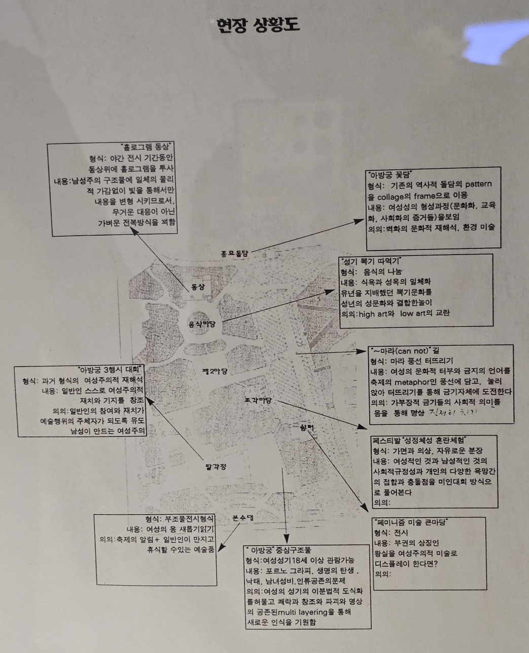 이 이야기는 4부 ‘거리 퍼포먼스’에서 한국 여성 미술가 그룹 ‘입김’의 아방궁 점거 프로젝트와도 자연스럽게 연결 지을 수 있다. 권위와 엄숙주의의 상징인 종묘 광장을 축제 공간으로 탈바꿈하는 퍼포먼스인데, ‘성기 뽁기 따먹기’, ‘성 정체성 혼란 체험'처럼 이름만 들어도 아찔한 프로그램으로 한국 사회의 가부장 구조에 저항한다.