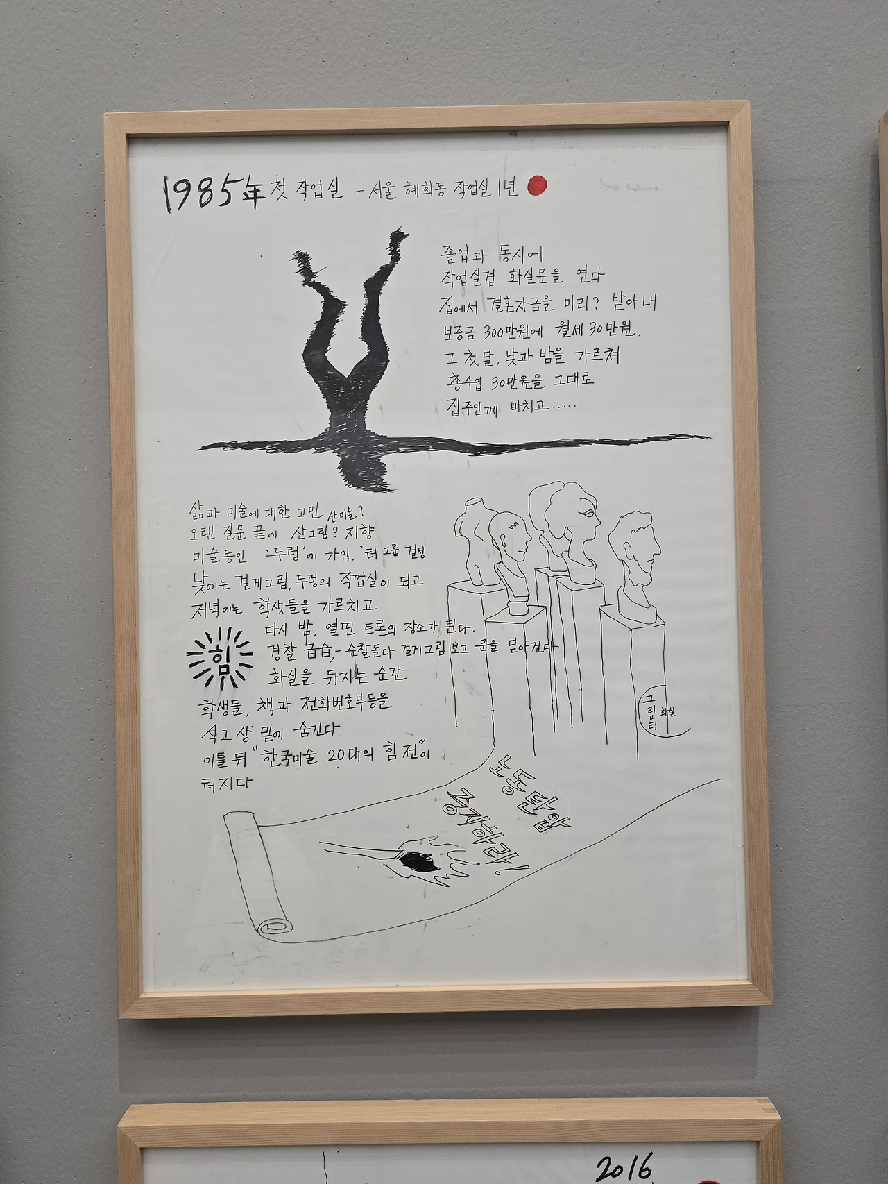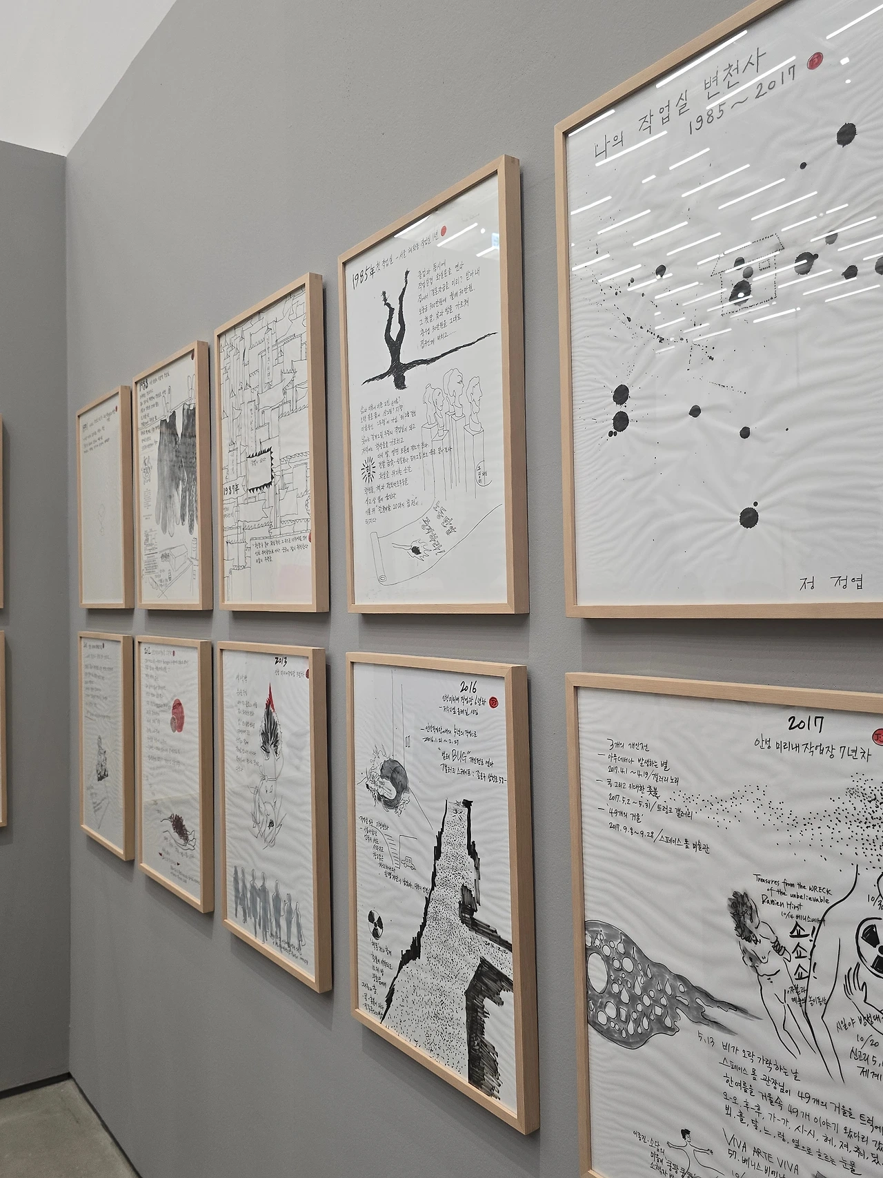 마치 일기를 쓰듯, 종이에 검정 마카로 그린 <나의 작업실 변천사 시리즈>. 1985-2017년에 걸친 작업실 변화 과정과 그 시기에 겪은 진솔한 이야기를 담은 드로잉 연작이다.