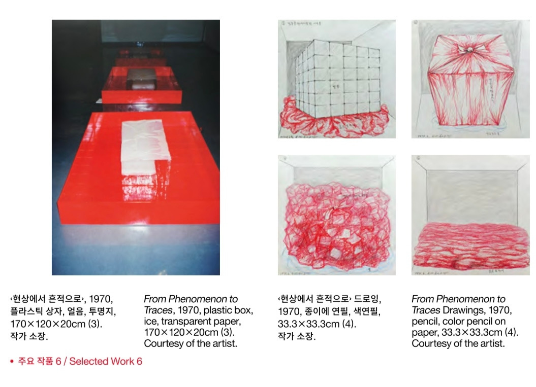 -1969-75년까지 한국아방가르드협회(AG)를 통해 단순 추상이냐 구상이냐 이분법에서 벗어나 다양한 미술의 현상을 받아들인다. 제 1회 AG전에서 커다란 사각형 붉은색 통3개에 각기 다른 사이즈의 얼음을 넣고 그 위에 트레이싱 종이를 올려놓아 시간의 흐름에 따라 얼음이 녹고, 종이가 물에 빠지고, 물마저 증발하면서 어그러지는 종이만 남는 작품 <현상에서 흔적으로>를 공개한다. 내가 갔던 시간대에는 얼음은 이미 녹고 물 안에 종이가 들어있는 상태였다. 자연의 변화에 비하면 작품의 변화는 턱없이 빨랐을 텐데, 내 눈에는 그 변화가 보이지 않아서 막연하게 ‘그렇겠구나’라고 상상을 했다. 자연스럽게 두면 무언가가 생성되고 소멸하는 과정이 이루어진다. 인생과 인간관계에 대입해 보면 생성과 소멸은 자연스러운 현상인데 왜 이렇게 일상에서 받아들이기 힘든지 모르겠다.