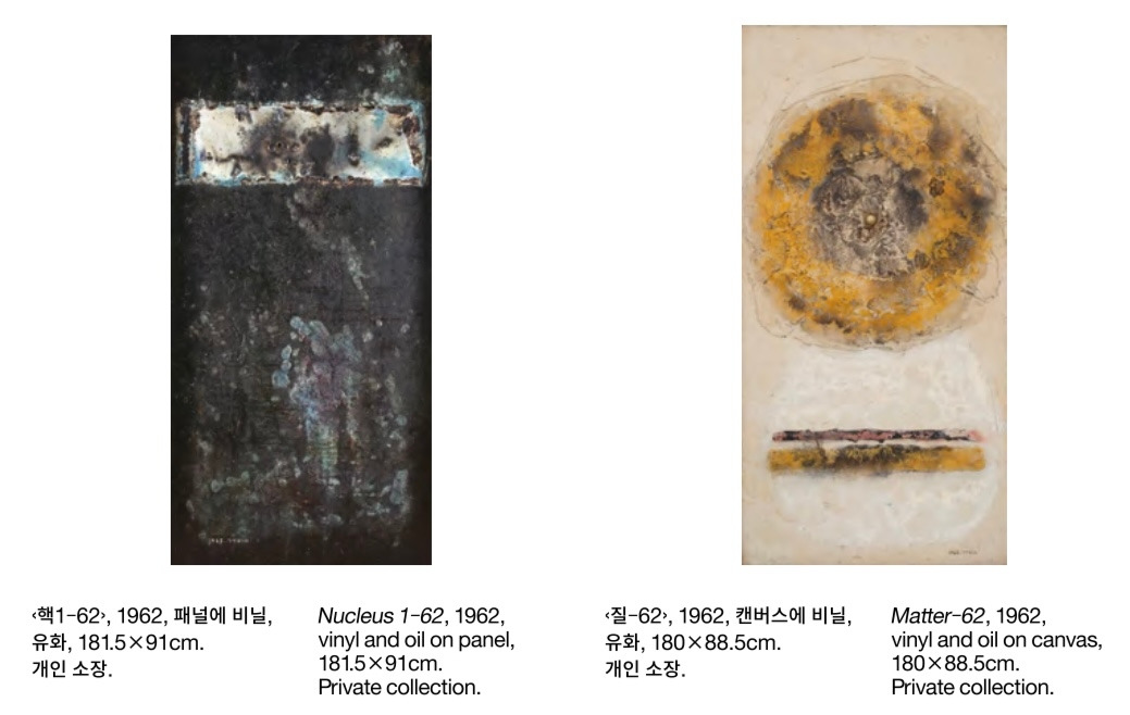-그도 그럴 것이 37년생인 우리 외할머니보다 한 살 오빠이시다. 격동의 한국에서 시대의 물살을 빠르게 타며 계속 새로운 재료, 매체, 방법을 탐구한다. 전쟁의 상처와 유럽인의 실존이 담긴 덕지덕지 처바르는 앵포르멜 회화가 소개되던 1960년대에 작가는 죽음, 핵, 질, 면과 같은 이름에서 보이는 것처럼 인간 실존에 대한 고민을 캔버스에 표현한다. 나름대로 반항적 기질을 ‘붓으로 그리지 않는 회화’로 표현하는데, 가장자리가 불에 타버린 비닐의 흔적 같은 것들을 재료로 활용했다.