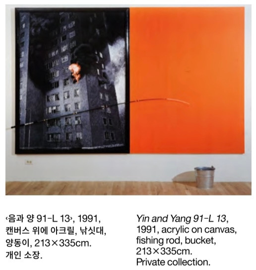 -1984년, 40대 후반 미국으로 떠난 작가는 맨해튼 빌딩 숲에서 자연에 대한 순수한 동경을 가지게 된다. 두 개로 이뤄진 내 키만 한 캔버스에 한쪽엔 불타고 있는 고층 빌딩, 다른 한 쪽은 주황색 면이 칠해져 있고 낚싯대, 물통이 놓여 있다. <음과 양 91-L 13>1991 은 자연과 인공의 대비를 강조하며 보여준다. 사실적인 도시풍경과 색 면, 그 도시 위에 일어나는 재해, 물과 불. 왜 낚싯대였을까? 생각해 본다.