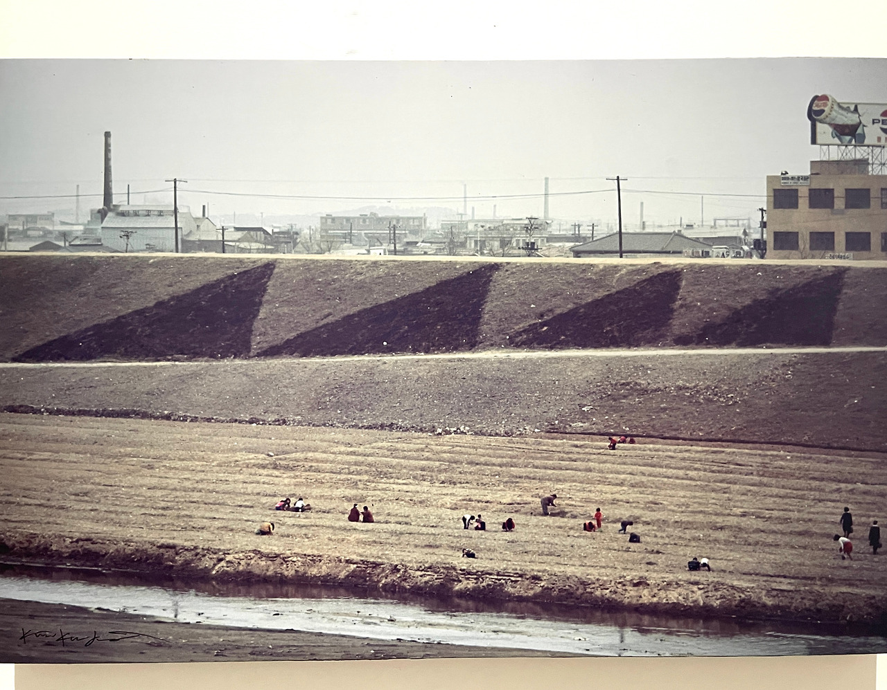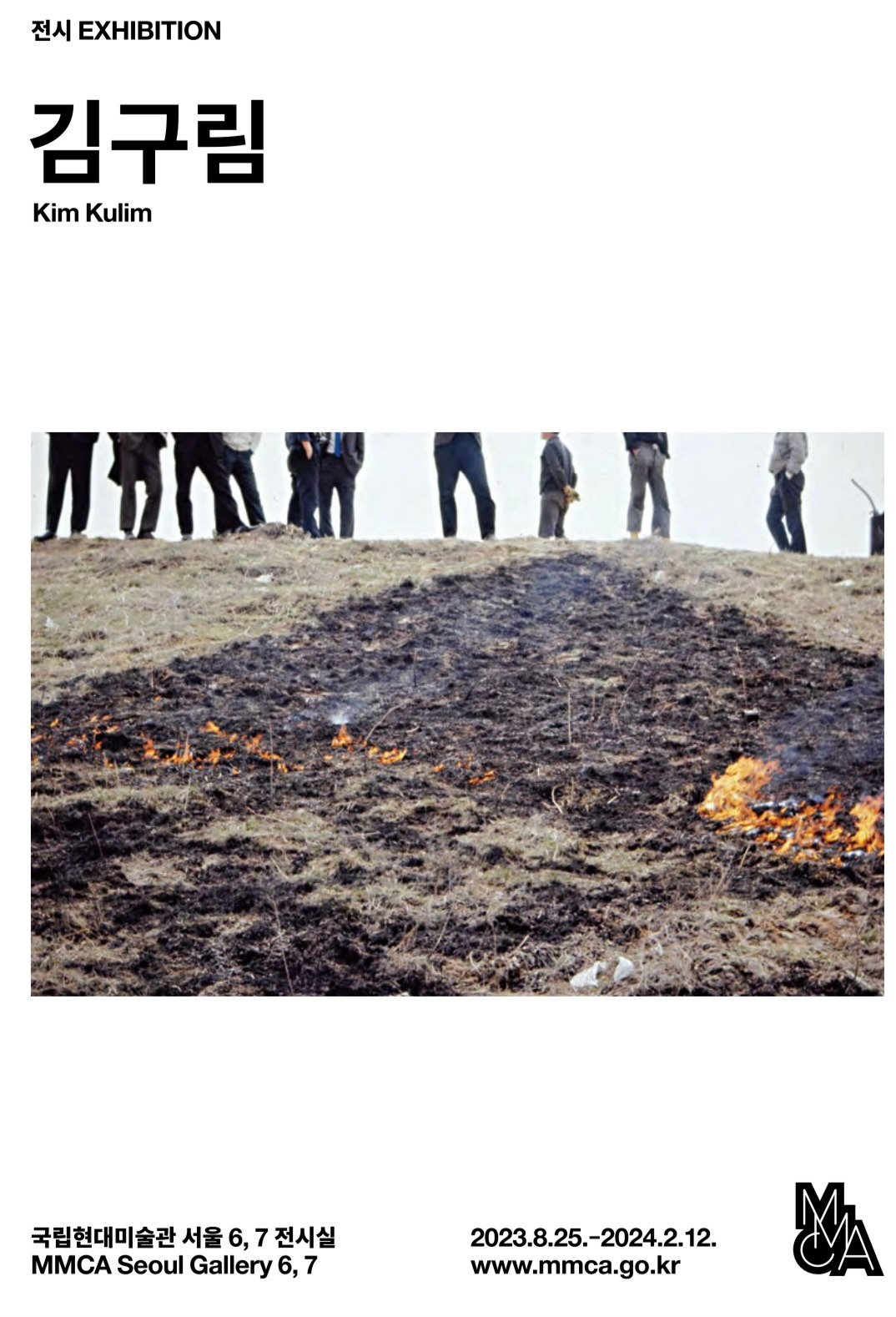 -김구림 작가에게는 ’최초‘라는 수식어가 자주 붙는다. 그중 하나가 사진 자료로 남아있는 대지 미술 프로젝트이다. <현상에서 흔적으로- 불과 잔디에 의한 이벤트>,1970 는 대보름에 논과 밭을 태우는 쥐불놀이에서 얻은 아이디어로 한양대 앞 강나루 건너편 살곶이 다리 옆으로 100여 미터 경사면에 골을 파서 7개의 삼각형을 만들고 잔디에 불을 놓은 것이다. 불에 탄 삼각형은 검게 그을렸고, 그을리지 않은 곳도 삼각형이 만들어졌다. 본래 같은 물질이었으나, 태우는 행위를 통해 불타버린 잔디는 다른 ‘현상’으로 남았다. 푸른 잔디가 돋아나는 땅에 그을린 흔적이 남는 것까지도 작품에 포함된다. 이것은 다른 작품들도 그렇듯, ‘음과 양’으로 표현된다. 그동안 몰라보게 변한 뚝섬이 반가웠다.