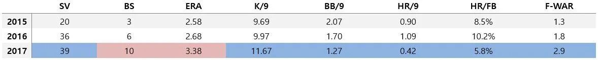 그러나 세부지표들에 있어서는 모두 확실히 발전된 모습을 보였다. 마무리 투수의 핵심 덕목인 이닝 당 삼진(11.67)이 커리어 최초로 두 자릿수에 들어섰고, 이닝 당 볼넷 비율(1.27)과 이닝 당 홈런 비율(0.42) 그리고 플라이볼이 홈런이 되는 비율(5.8)까지 모두 커리어 최저를 기록했다. 특히 수비 배제 자책점에 해당하는 FIP는 커리어 최저인 1.74를 기록했다.