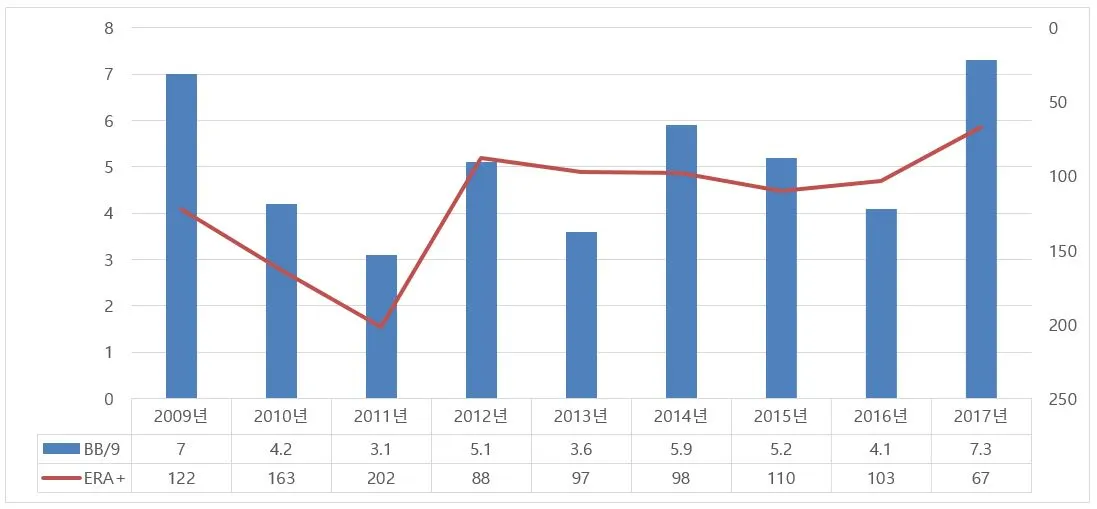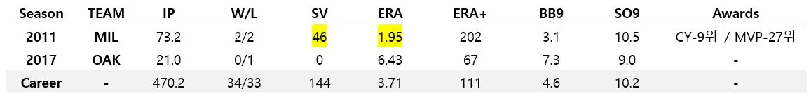 그렇기에 Axford의 성적은 제구력을 안정시키고 볼넷 허용을 얼마나 줄일 수 있느냐에 달려 있다고 할 수 있다. 그리고 실제 그의 ERA+와 BB/9은 서로 반비례하는 모습을 보여주고 있기도 하다. 커리어하이 시즌인 2011년이 그에게 BB/9가 3.1로 가장 낮았던 때이기도 하며, BB/9이 가장 높았던 지난 시즌이 그에겐 최악의 시즌이 된 것처럼 말이다.