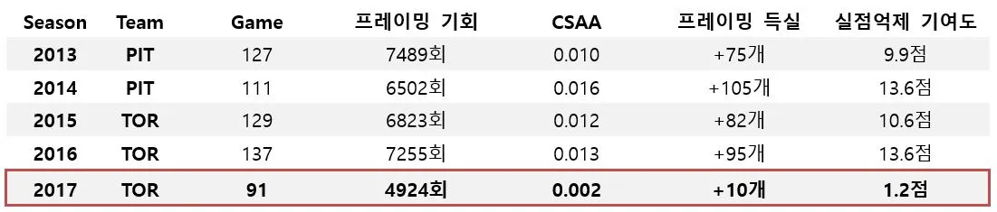 하지만 제이스로 넘어와 새롭게 합을 맞추게 된 포수 Russell Martin은, 그가 부진했을 때조차도 앞서 언급했던 포수들보다 우월한 프레이밍 능력을 보여주는 포수였다. 이전 소속팀에서는 볼로 판정 받았을 공들이, 그의 프레이밍을 통해 스트라이크가 되자, 투수들의 볼넷은 자연스럽게 줄고 방어율 자체도 좋아질 수 밖에 없었던 것이다.