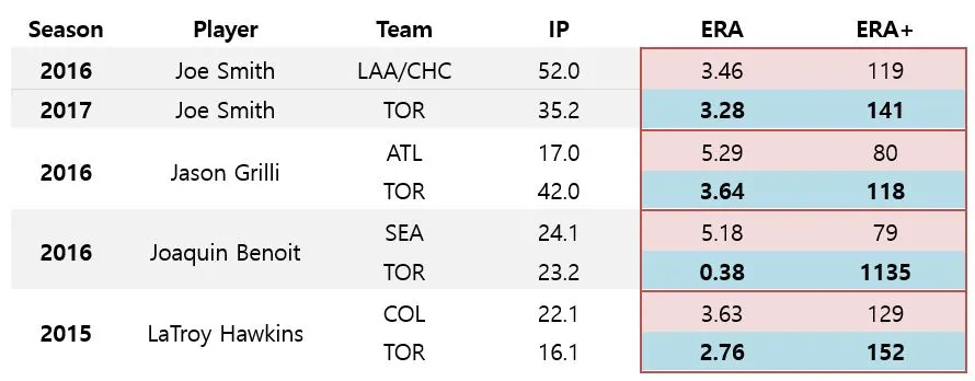 2015시즌에는 비록 부진하진 않았지만, 시즌 종료 후 은퇴를 공식적으로 발표했던 메이저리그 최고령 투수 LaTroy Hawkins를 트레이드로 영입해 30여년만의 포스트시즌 진출에 박차를 가하기도 했었다. 그리고 이와 같이 지난 3년동안 제이스에 합류했던 30대 불펜 투수들은 모두 개인 성적의 향상은 물론, 팀에도 큰 기여를 하며 더 나은 조건으로 커리어를 이어가거나 혹은 가정으로 돌아갈 수 있었다.