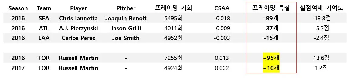 투수가 프레이밍이 좋은 포수와 호흡을 맞춘다면, 보더라인에서 살짝 벗어나는 공을 던지더라도 스트라이크 판정을 받을 확률이 증가한다. 그러다보면 볼넷이 줄어드는 것은 당연한 일이 되며, 볼넷이 줄면 당연히 실점도 줄어들게 되고 투수의 개인성적은 좋아진다. 즉, 어떤 포수와 호흡을 맞추는지가 투수의 개인성적에도 즉각적인 영향을 미칠 확률이 높다는 것이다.