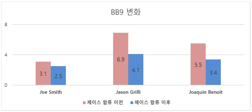 이렇게 제이스로 합류한 불펜 투수들이 성공적으로 리바운딩하여 팀에 보탬에 될 수 있었던 이유 중 하나는 바로 볼넷비율의 감소였다. 올스타 유격수가 포함된 트레이드를 통해 제이스로 넘어온 Hawkins만을 제외하고, 앞서 언급한 3명의 불펜 투수 모두 제이스로 넘어와 직전 시즌 혹은 직전 팀에서보다 볼넷 비율을 줄일 수 있었다.